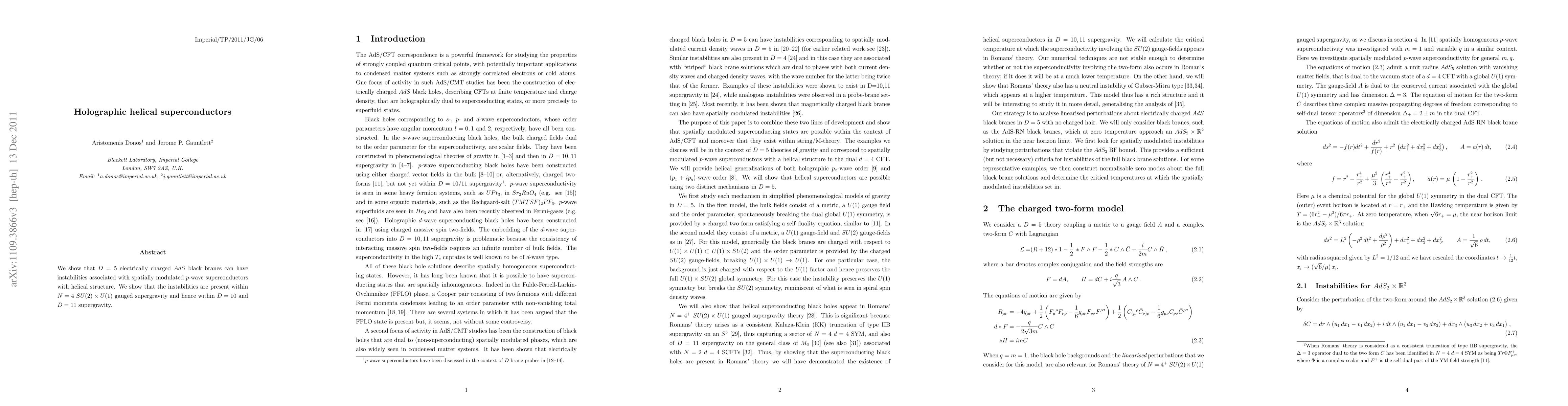 We show that D=5 electrically charged AdS black branes can have instabilities associated with spatially modulated p-wave superconductors with helical structure. We show that the instabilities are present within N=4 $SU(2)\times U(1)$ gauged supergravity and hence within D=10 and D=11 supergravity.
