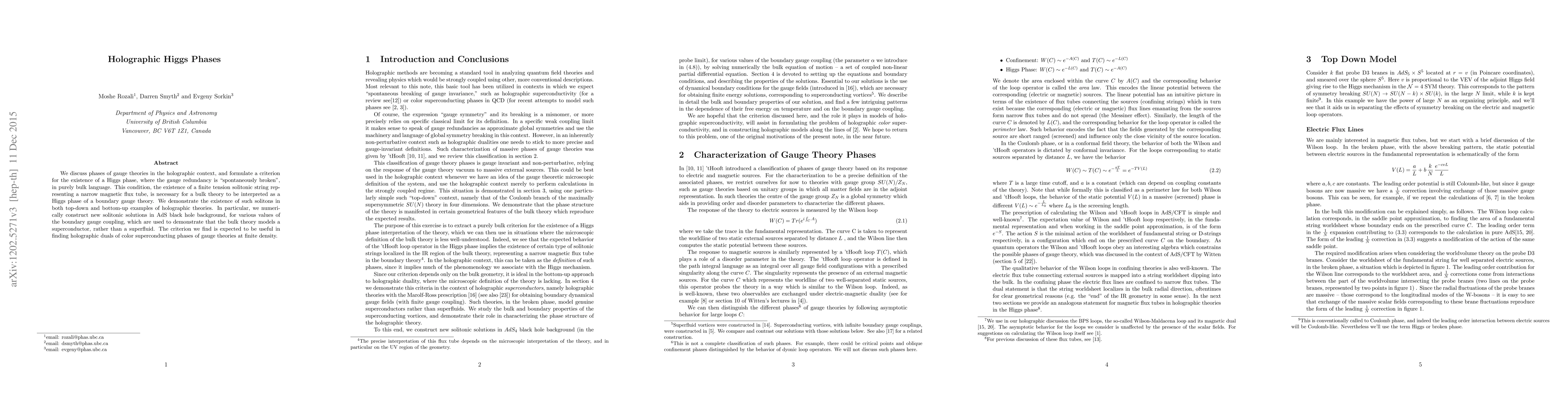 This paper formulates a criterion for the existence of a Higgs phase in holographic gauge theories, identifying the presence of a finite tension solitonic string as a necessary condition. It demonstrates this criterion through new solitonic solutions in AdS black hole backgrounds, showing that the bulk theory models a superconductor rather than a superfluid.