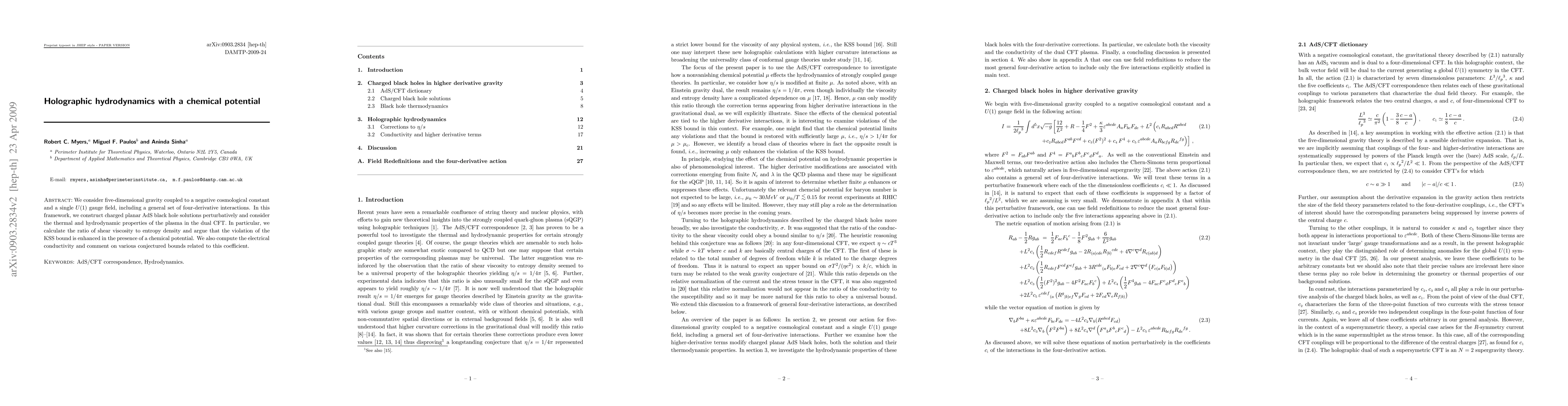 We consider five-dimensional gravity coupled to a negative cosmological constant and a single U(1) gauge field, including a general set of four-derivative interactions. In this framework, we construct charged planar AdS black hole solutions perturbatively and consider the thermal and hydrodynamic properties of the plasma in the dual CFT. In particular, we calculate the ratio of shear viscosity to entropy density and argue that the violation of the KSS bound is enhanced in the presence of a chemical potential. We also compute the electrical conductivity and comment on various conjectured bounds related to this coefficient.