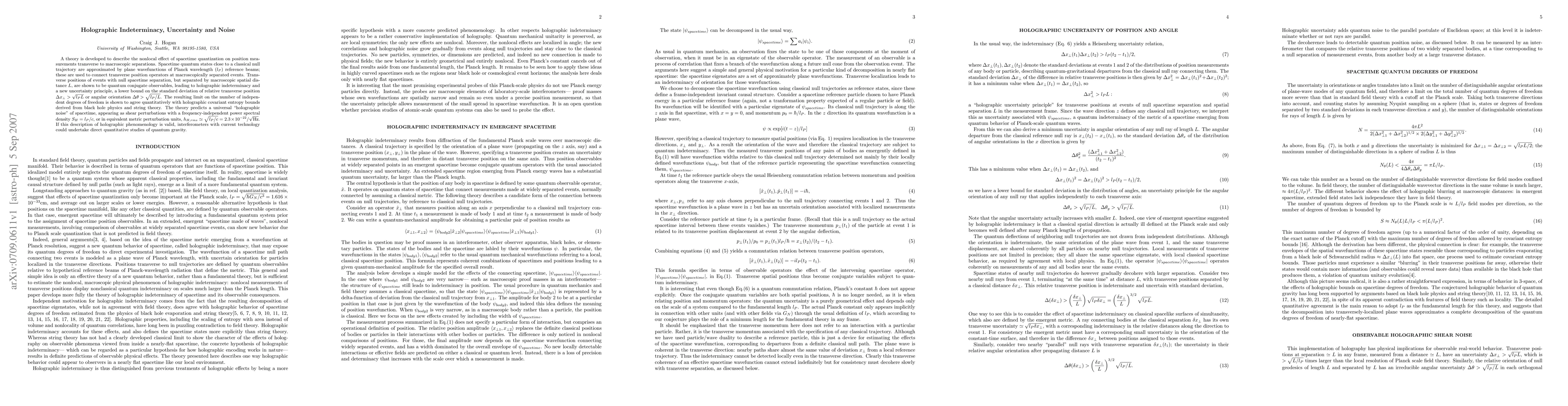 A theory is developed to describe the nonlocal effect of spacetime quantization on position measurements transverse to macroscopic separations. Spacetime quantum states close to a classical null trajectory are approximated by plane wavefunctions of Planck wavelength (l_P) reference beams; these are used to connect transverse position operators at macroscopically separated events. Transverse positions of events with null spacetime separation, but separated by macroscopic spatial distance $L$, are shown to be quantum conjugate observables, leading to holographic indeterminacy and a new uncertainty principle, a lower bound on the standard deviation of relative transverse position \Delta x_\perp > \sqrt{l_PL} or angular orientation \Delta\theta > \sqrt{l_P/L}. The resulting limit on the number of independent degrees of freedom is shown to agree quantitatively with holographic covariant entropy bounds derived from black hole physics and string theory. The theory predicts a universal ``holographic noise'' of spacetime, appearing as shear perturbations with a frequency-independent power spectral density S_H=l_P/c, or in equivalent metric perturbation units, h_{H,rms} \sqrt{l_P/c} = 2.3 \times 10^{-22} /\sqrt{Hz}. If this description of holographic phenomenology is valid, interferometers with current technology could undertake direct quantitative studies of quantum gravity.