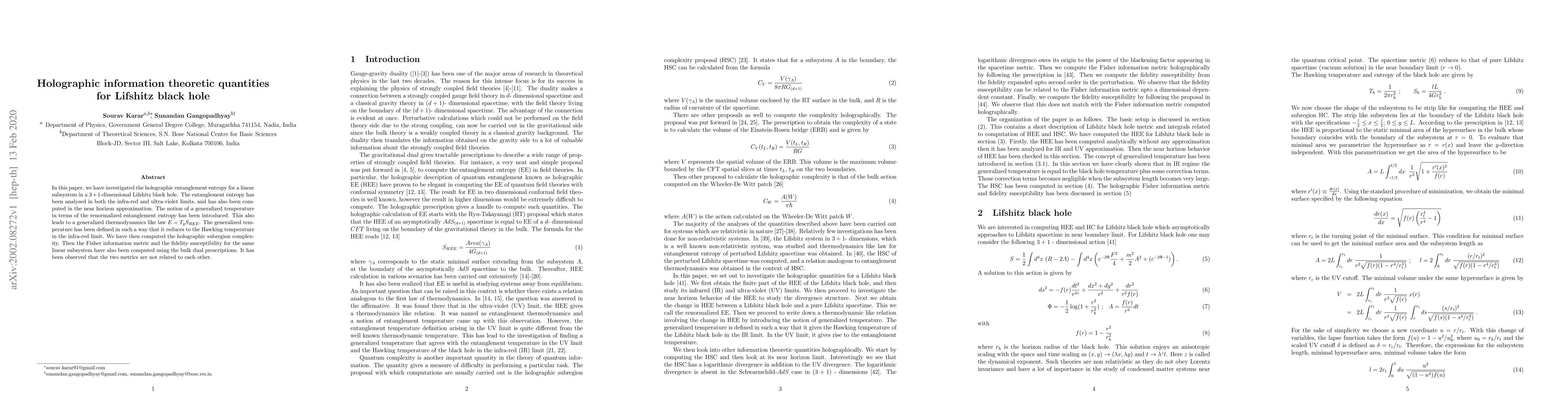 In this paper, we have investigated the holographic entanglement entropy for a linear subsystem in a $3+1$-dimensional Lifshitz black hole. The entanglement entropy has been analysed in both the infra-red and ultra-violet limits, and has also been computed in the near horizon approximation. The notion of a generalized temperature in terms of the renormalized entanglement entropy has been introduced. This also leads to a generalized thermodynamics like law $E=T_g S_{REE}$. The generalized temperature has been defined in such a way that it reduces to the Hawking temperature in the infra-red limit. We have then computed the holographic subregion complexity. Then the Fisher information metric and the fidelity susceptibility for the same linear subsystem have also been computed using the bulk dual prescriptions. It has been observed that the two metrics are not related to each other.