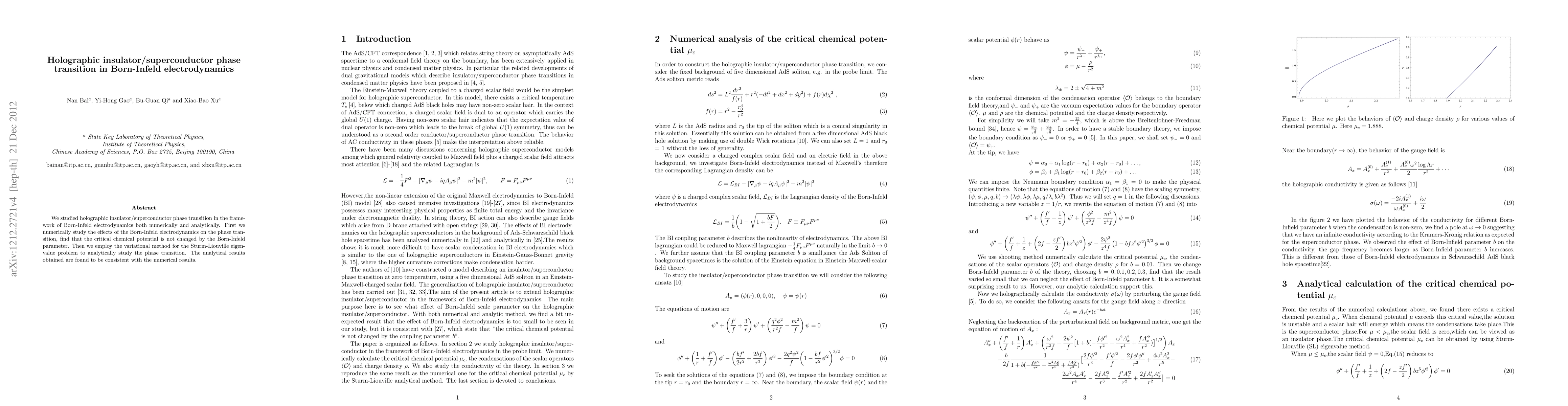 This paper investigates the holographic insulator/superconductor phase transition in Born-Infeld electrodynamics using both numerical and analytical methods. The study finds that the critical chemical potential remains unchanged by the Born-Infeld parameter, with analytical results aligning with numerical findings.