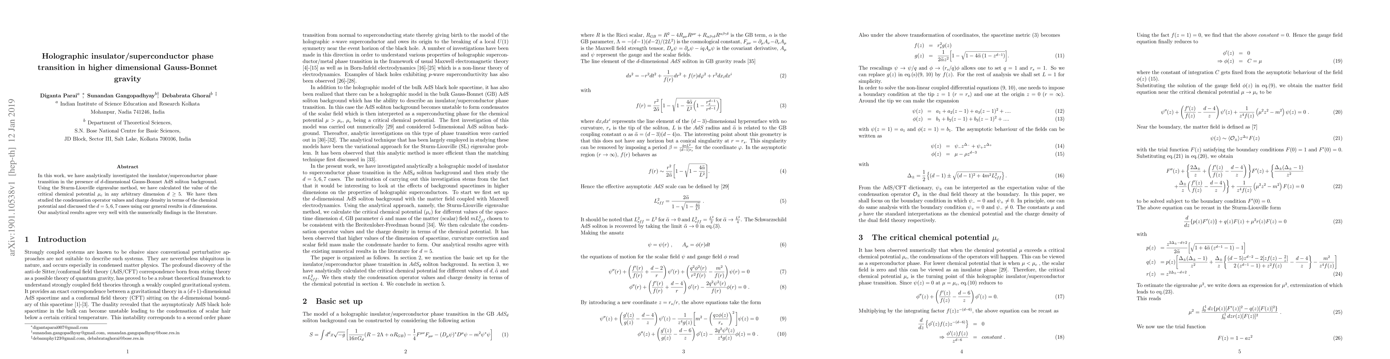 This paper analytically investigates the insulator/superconductor phase transition in higher-dimensional Gauss-Bonnet gravity, calculating the critical chemical potential $\mu_c$ using the Sturm-Liouville method. The study discusses the $d=5, 6, 7$ cases, finding agreement with numerical results in the literature.
