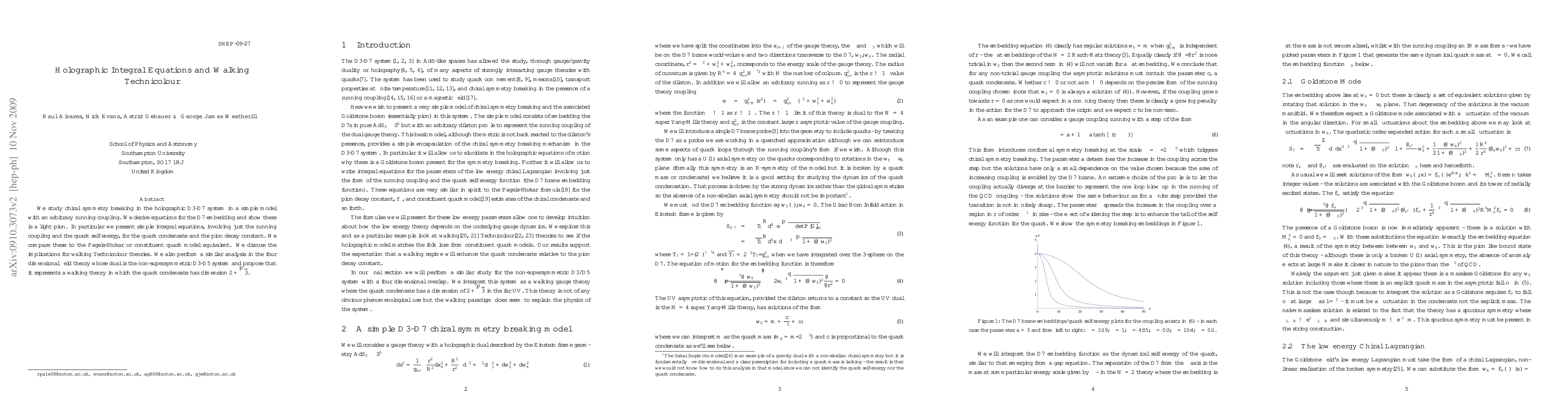 We study chiral symmetry breaking in the holographic D3-D7 system in a simple model with an arbitrary running coupling. We derive equations for the D7 embedding and show there is a light pion. In particular we present simple integral equations, involving just the running coupling and the quark self energy, for the quark condensate and the pion decay constant. We compare these to the Pagels-Stokar or constituent quark model equivalent. We discuss the implications for walking Technicolour theories. We also perform a similar analysis in the four dimensional field theory whose dual is the non-supersymmetric D3-D5 system and propose that it represents a walking theory in which the quark condensate has dimension 2 + sqrt{3}.