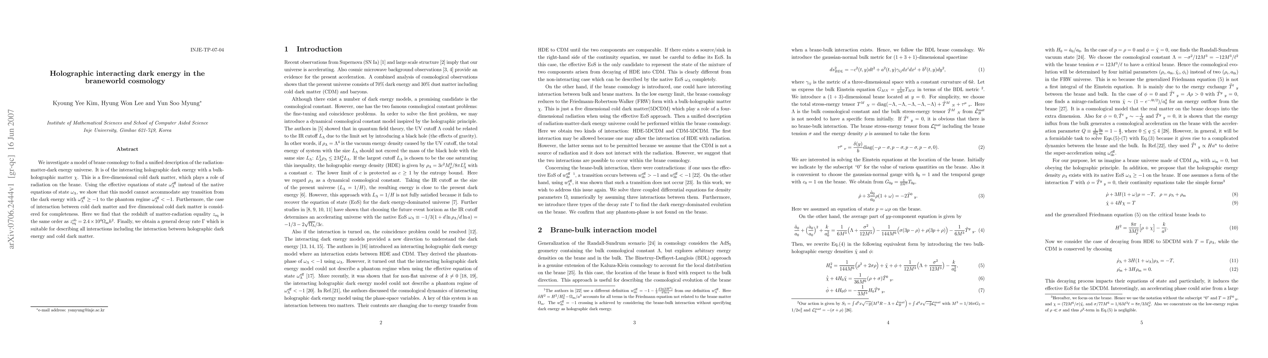 We investigate a model of brane cosmology to find a unified description of the radiation-matter-dark energy universe. It is of the interacting holographic dark energy with a bulk-holographic matter $\chi$. This is a five-dimensional cold dark matter, which plays a role of radiation on the brane. Using the effective equations of state $\omega^{\rm eff}_{\rm \Lambda}$ instead of the native equations of state $\omega_{\rm \Lambda}$, we show that this model cannot accommodate any transition from the dark energy with $\omega^{\rm eff}_{\rm \Lambda}\ge-1$ to the phantom regime $\omega^{\rm eff}_{\rm \Lambda}<-1$. Furthermore, the case of interaction between cold dark matter and five dimensional cold dark matter is considered for completeness. Here we find that the redshift of matter-radiation equality $z_{\rm eq}$ is the same order as $z^{\rm ob}_{\rm eq}=2.4\times10^{4} \Omega_{\rm m}h^2$. Finally, we obtain a general decay rate $\Gamma$ which is suitable for describing all interactions including the interaction between holographic dark energy and cold dark matter.