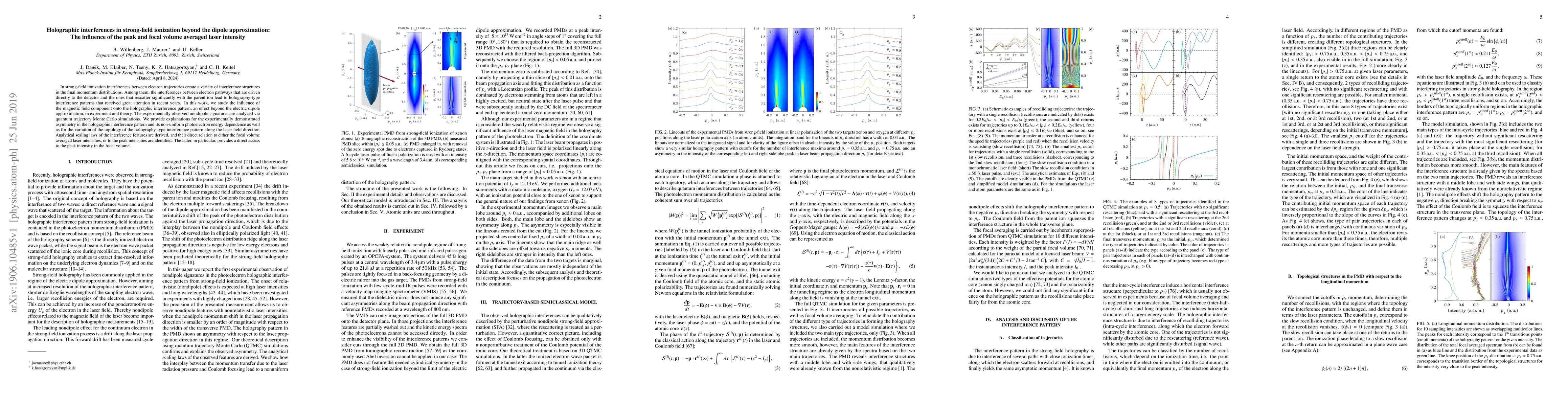 This paper investigates holographic interference patterns in strong-field ionization beyond the dipole approximation, focusing on the influence of magnetic field components and laser intensity variations. Analytical scaling laws are derived to explain the observed asymmetries and energy dependencies, linking them to peak laser intensities in the focal volume.