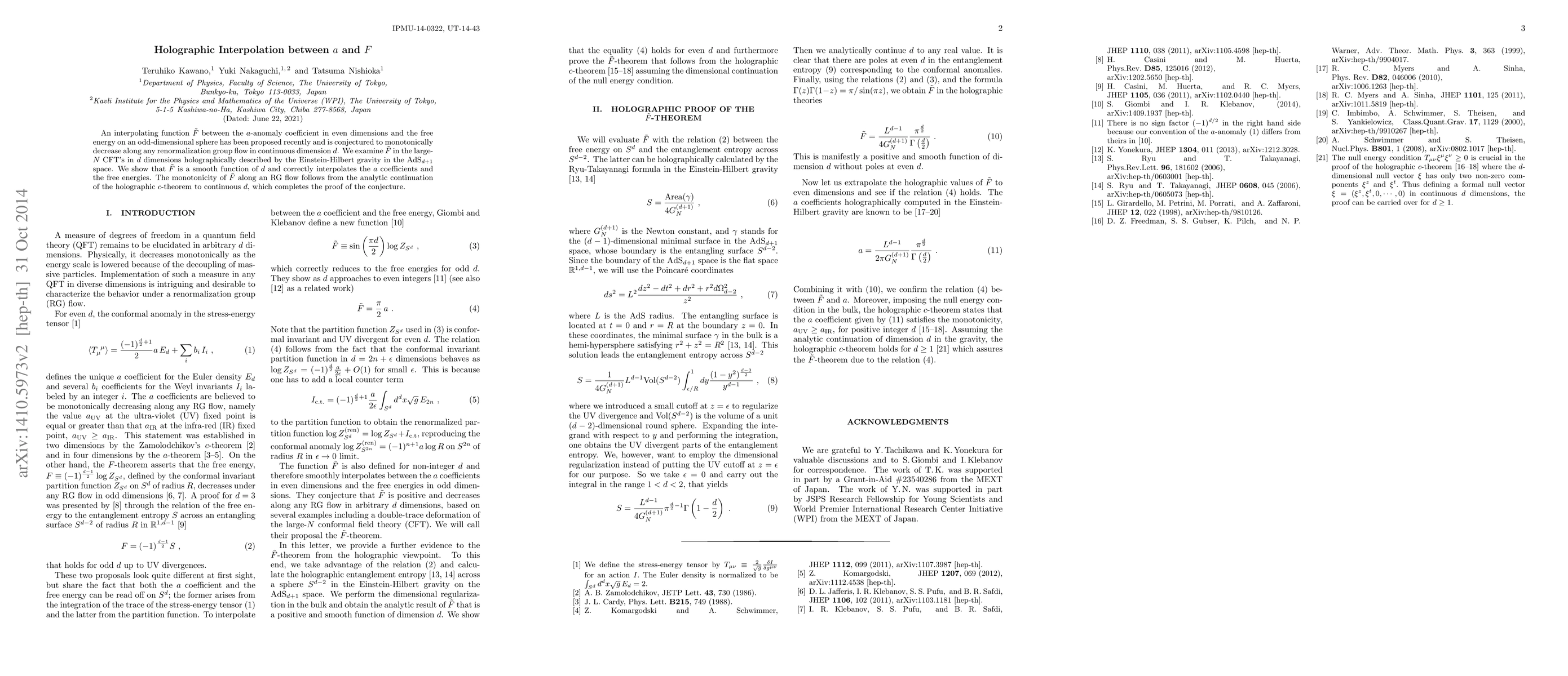 An interpolating function $\tilde F$ between the $a$-anomaly coefficient in even dimensions and the free energy on an odd-dimensional sphere has been proposed recently and is conjectured to monotonically decrease along any renormalization group flow in continuous dimension $d$. We examine $\tilde F$ in the large-$N$ CFT's in $d$ dimensions holographically described by the Einstein-Hilbert gravity in the AdS$_{d+1}$ space. We show that $\tilde F$ is a smooth function of $d$ and correctly interpolates the $a$ coefficients and the free energies. The monotonicity of $\tilde F$ along an RG flow follows from the analytic continuation of the holographic $c$-theorem to continuous $d$, which completes the proof of the conjecture.