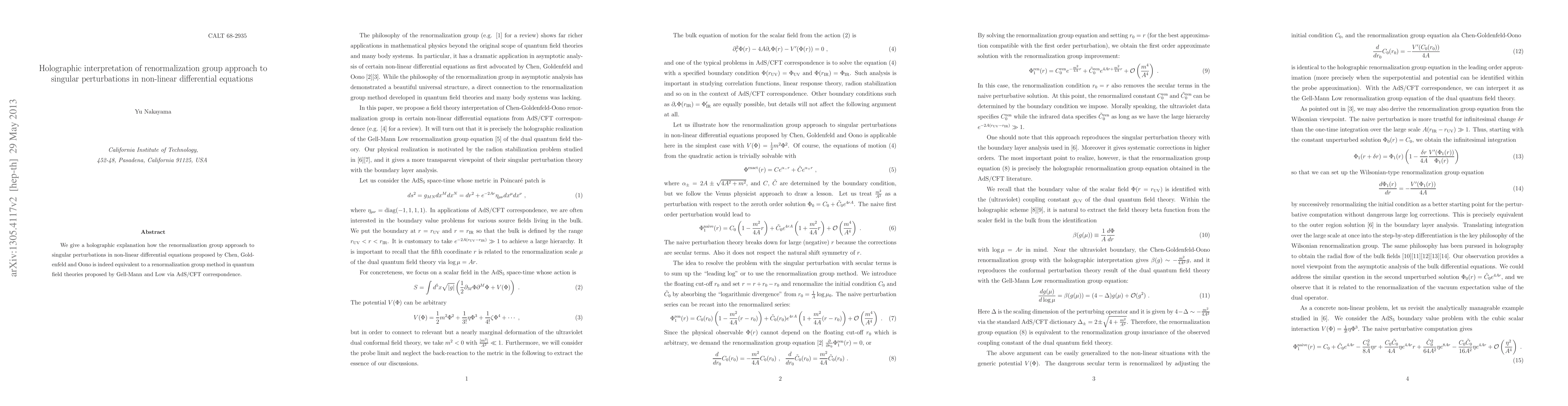 We give a holographic explanation how the renormalization group approach to singular perturbations in non-linear differential equations proposed by Chen, Goldenfeld and Oono is indeed equivalent to a renormalization group method in quantum field theories proposed by Gell-Mann and Low via AdS/CFT correspondence.