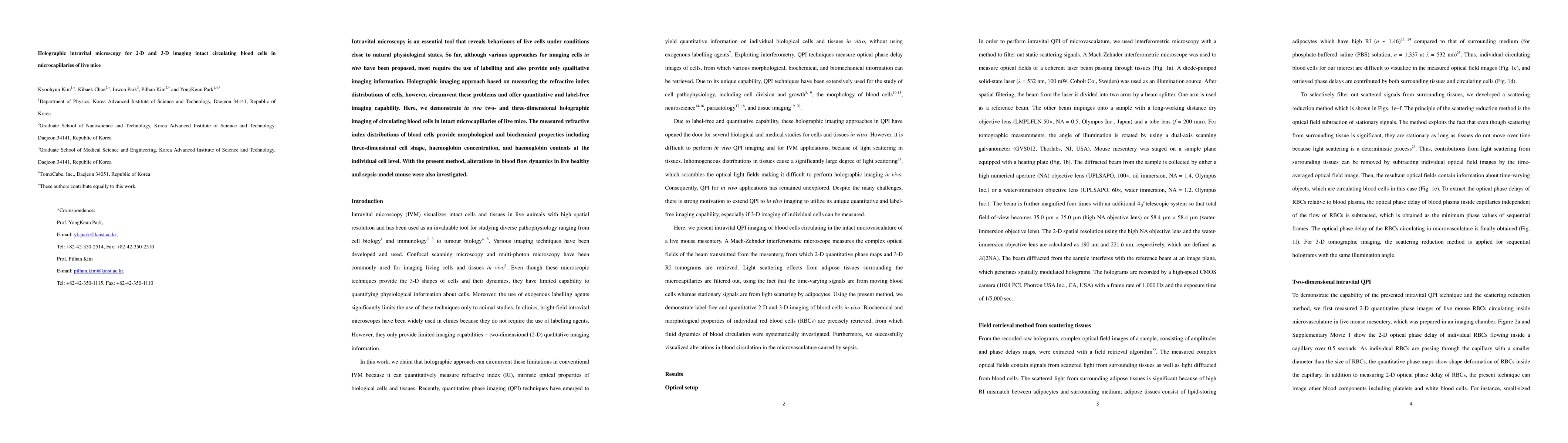 This paper presents a holographic intravital microscopy technique for quantitative, label-free imaging of circulating blood cells in live mice, providing 2-D and 3-D morphological and biochemical information, including cell shape, haemoglobin concentration, and contents. The method is applied to study blood flow dynamics in healthy and sepsis-model mice.