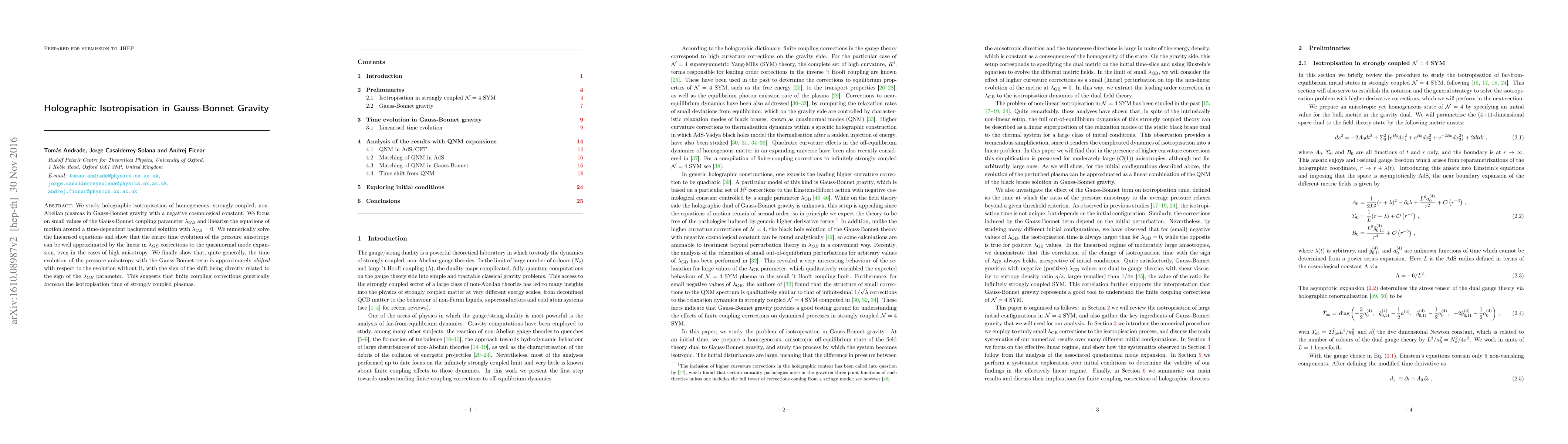 The study investigates the isotropisation of strongly coupled, non-Abelian plasmas in Gauss-Bonnet gravity, revealing that small Gauss-Bonnet coupling increases the time required for anisotropy to decrease, suggesting a shift in isotropisation dynamics with a sign dependent on the coupling parameter.