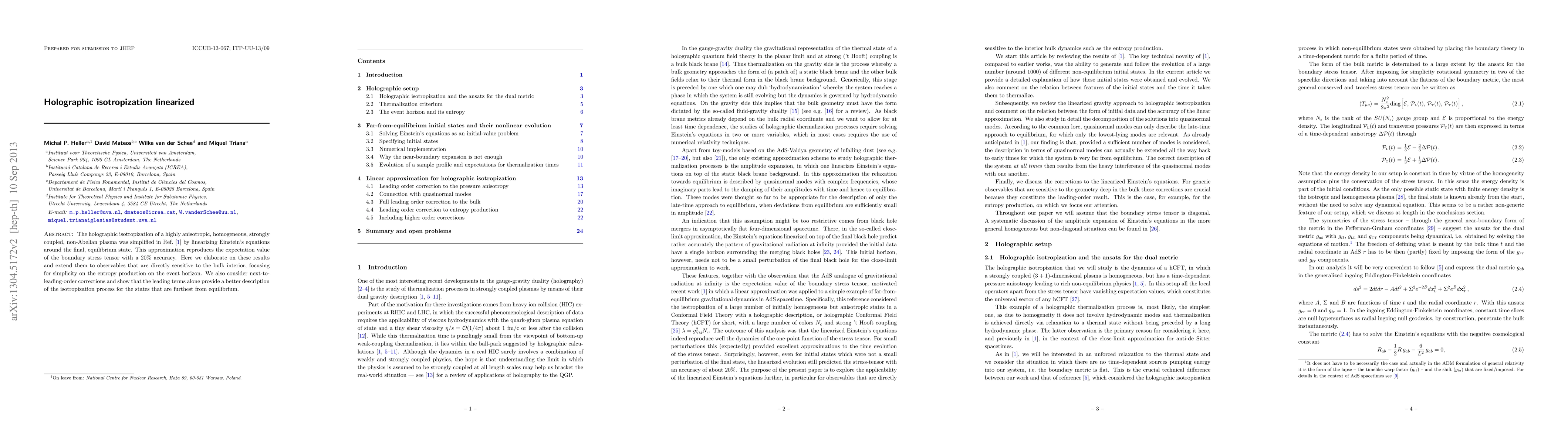 The holographic isotropization of a highly anisotropic, homogeneous, strongly coupled, non-Abelian plasma was simplified in arXiv:1202.0981 by linearizing Einstein's equations around the final, equilibrium state. This approximation reproduces the expectation value of the boundary stress tensor with a 20% accuracy. Here we elaborate on these results and extend them to observables that are directly sensitive to the bulk interior, focusing for simplicity on the entropy production on the event horizon. We also consider next-to-leading-order corrections and show that the leading terms alone provide a better description of the isotropization process for the states that are furthest from equilibrium.