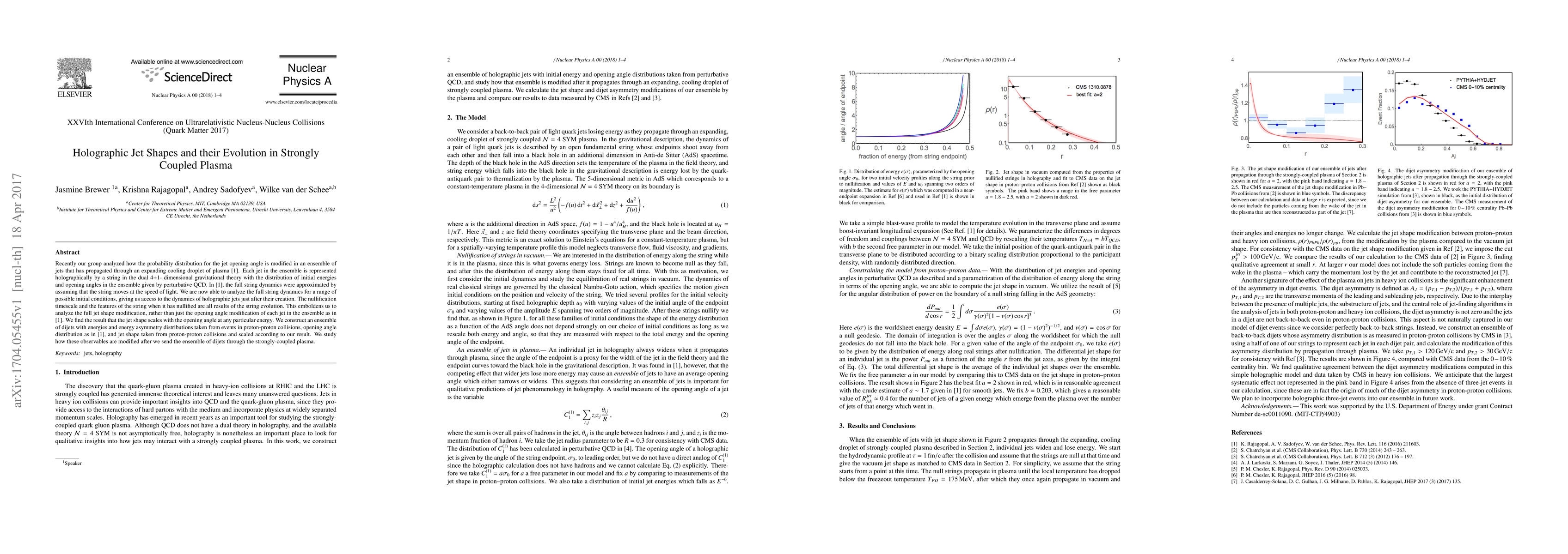 Recently our group analyzed how the probability distribution for the jet opening angle is modified in an ensemble of jets that has propagated through an expanding cooling droplet of plasma [1]. Each jet in the ensemble is represented holographically by a string in the dual 4+1- dimensional gravitational theory with the distribution of initial energies and opening angles in the ensemble given by perturbative QCD. In [1], the full string dynamics were approximated by assuming that the string moves at the speed of light. We are now able to analyze the full string dynamics for a range of possible initial conditions, giving us access to the dynamics of holographic jets just after their creation. The nullification timescale and the features of the string when it has nullified are all results of the string evolution. This emboldens us to analyze the full jet shape modification, rather than just the opening angle modification of each jet in the ensemble as in [1]. We find the result that the jet shape scales with the opening angle at any particular energy. We construct an ensemble of dijets with energies and energy asymmetry distributions taken from events in proton-proton collisions, opening angle distribution as in [1], and jet shape taken from proton-proton collisions and scaled according to our result. We study how these observables are modified after we send the ensemble of dijets through the strongly-coupled plasma.