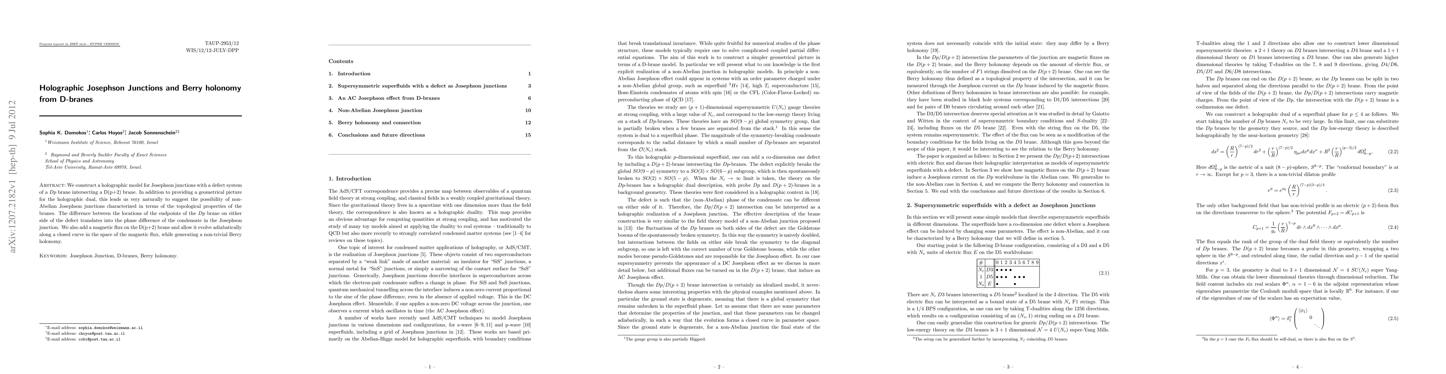We construct a holographic model for Josephson junctions with a defect system of a Dp brane intersecting a D(p+2) brane. In addition to providing a geometrical picture for the holographic dual, this leads us very naturally to suggest the possibility of non-Abelian Josephson junctions characterized in terms of the topological properties of the branes. The difference between the locations of the endpoints of the Dp brane on either side of the defect translates into the phase difference of the condensate in the Josephson junction. We also add a magnetic flux on the D(p+2) brane and allow it evolve adiabatically along a closed curve in the space of the magnetic flux, while generating a non-trivial Berry holonomy.