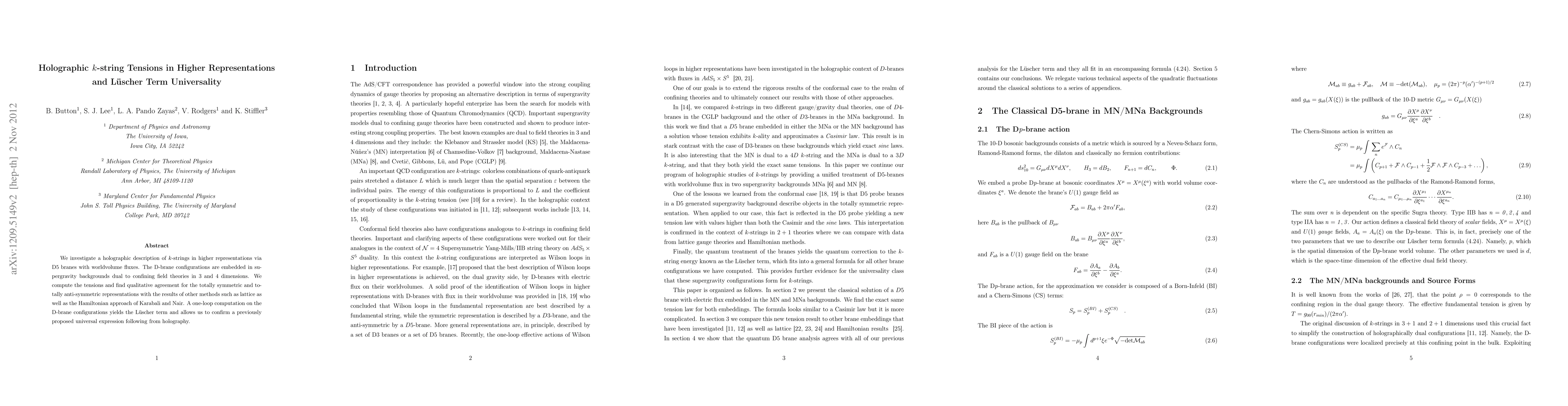 We investigate a holographic description of k-strings in higher representations via D5 branes with worldvolume fluxes. The D-brane configurations are embedded in supergravity backgrounds dual to confining field theories in 3 and 4 dimensions. We compute the tensions and find qualitative agreement for the totally symmetric and totally anti-symmetric representations with the results of other methods such as lattice as well as the Hamiltonian approach of Karabali and Nair. A one-loop computation on the D-brane configurations yields the Luescher term and allows us to confirm a previously proposed universal expression following from holography.