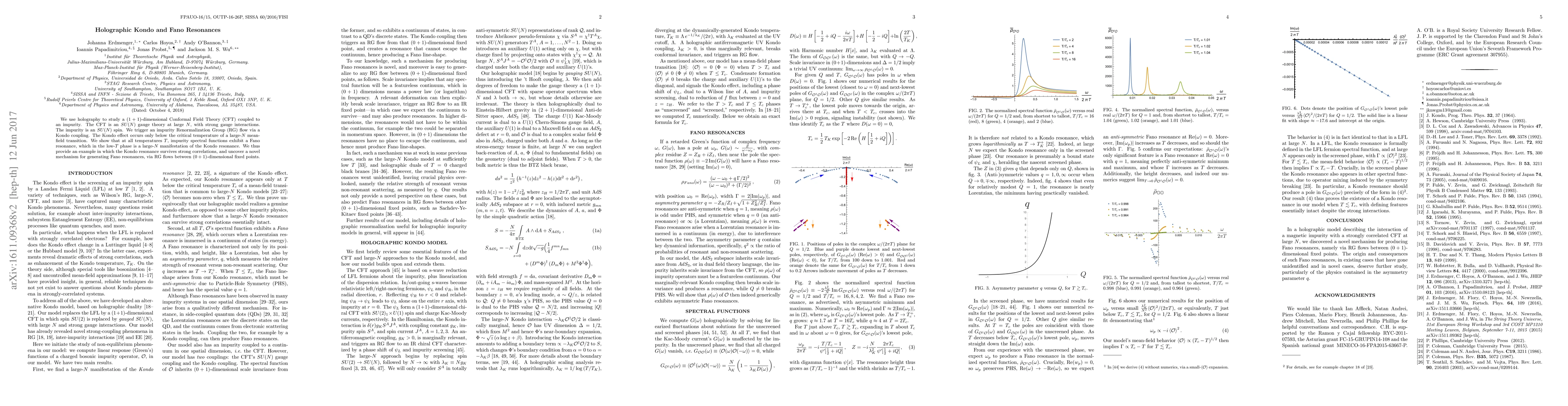 This paper employs holography to investigate a $(1+1)$-dimensional CFT with strong gauge interactions coupled to an impurity, revealing a Kondo effect below a critical temperature. It demonstrates that impurity spectral functions exhibit Fano resonances at all temperatures, providing a novel mechanism for generating these resonances through Renormalization Group flows.