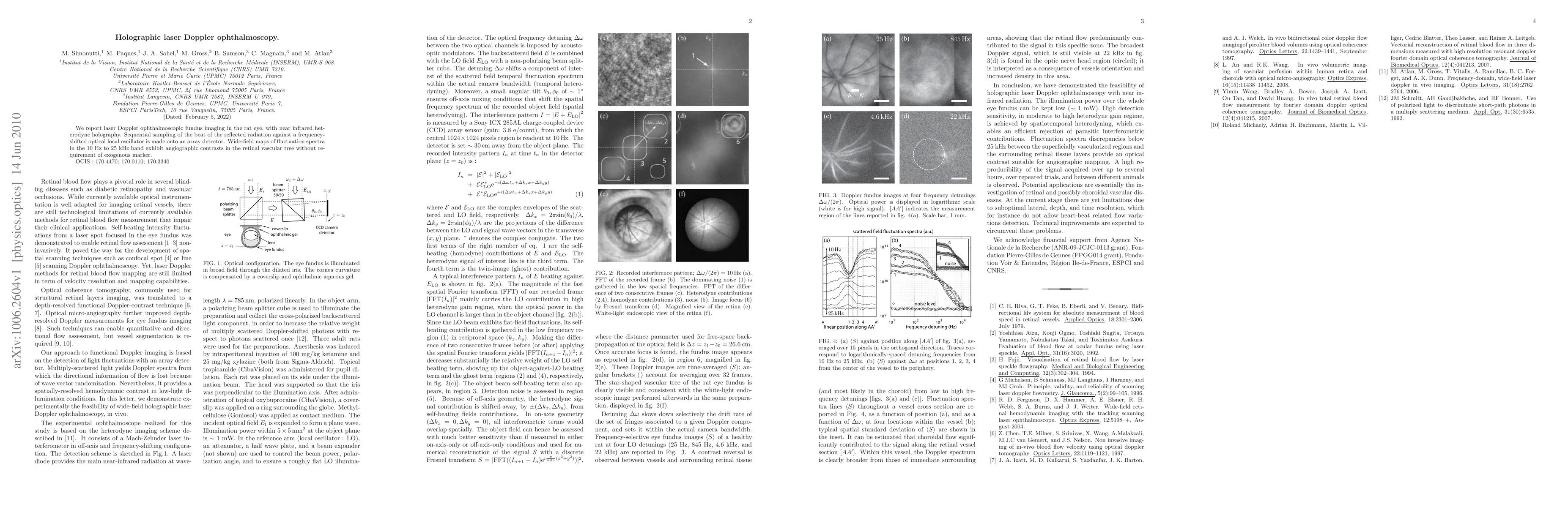 We report laser Doppler ophthalmoscopic fundus imaging in the rat eye with near-IR heterodyne holography. Sequential sampling of the beat of the reflected radiation against a frequency-shifted optical local oscillator is made onto an array detector. Wide-field maps of fluctuation spectra in the 10 Hz to 25 kHz band exhibit angiographic contrasts in the retinal vascular tree without requirement of an exogenous marker.