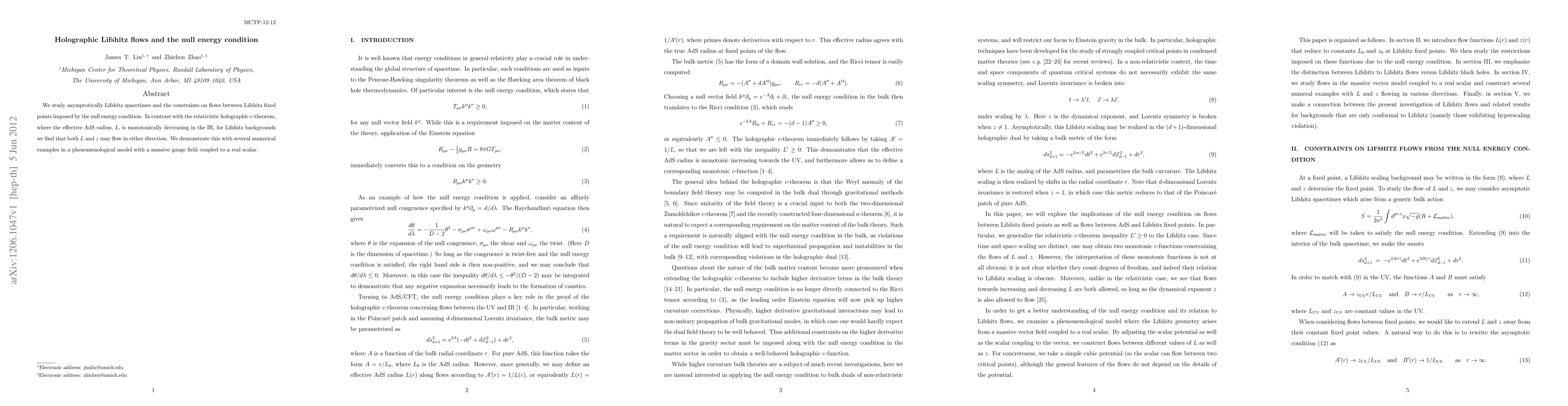 This paper investigates asymptotically Lifshitz spacetimes and examines how the null energy condition constrains the flow between Lifshitz fixed points. Unlike the AdS radius behavior in holographic c-theorems, Lifshitz backgrounds allow for bidirectional flow of both L and z, as demonstrated through numerical examples in a model with a massive gauge field and a scalar.