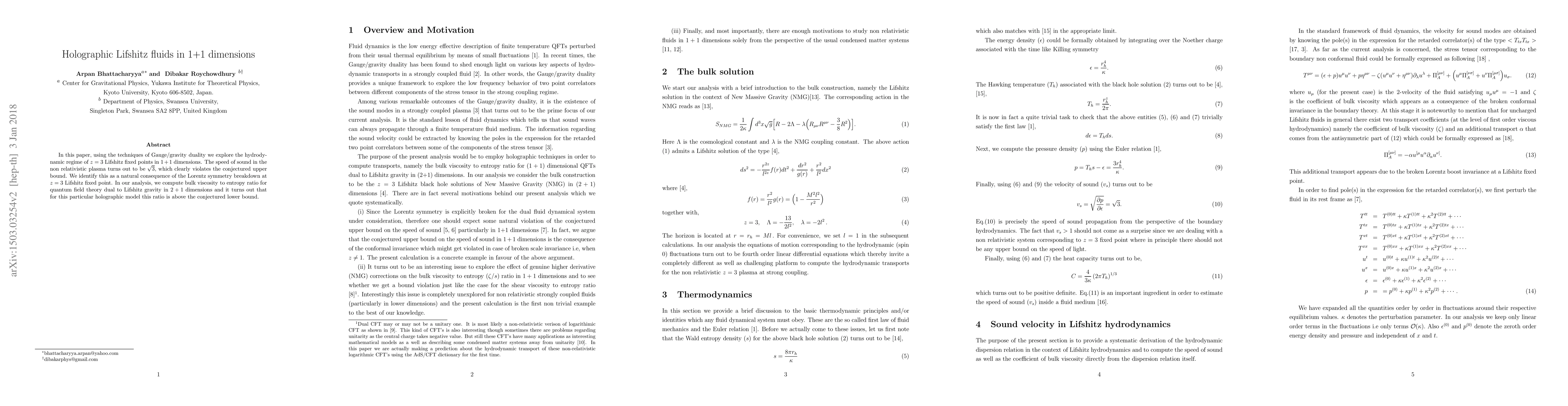 This paper investigates the hydrodynamic regime of $z=3$ Lifshitz fluids in $1+1$ dimensions via Gauge/gravity duality, finding a sound speed of $\sqrt{3}$ that violates the upper bound, attributed to Lorentz symmetry breakdown. It also reveals that the bulk viscosity to entropy ratio in the holographic dual exceeds the conjectured lower bound.