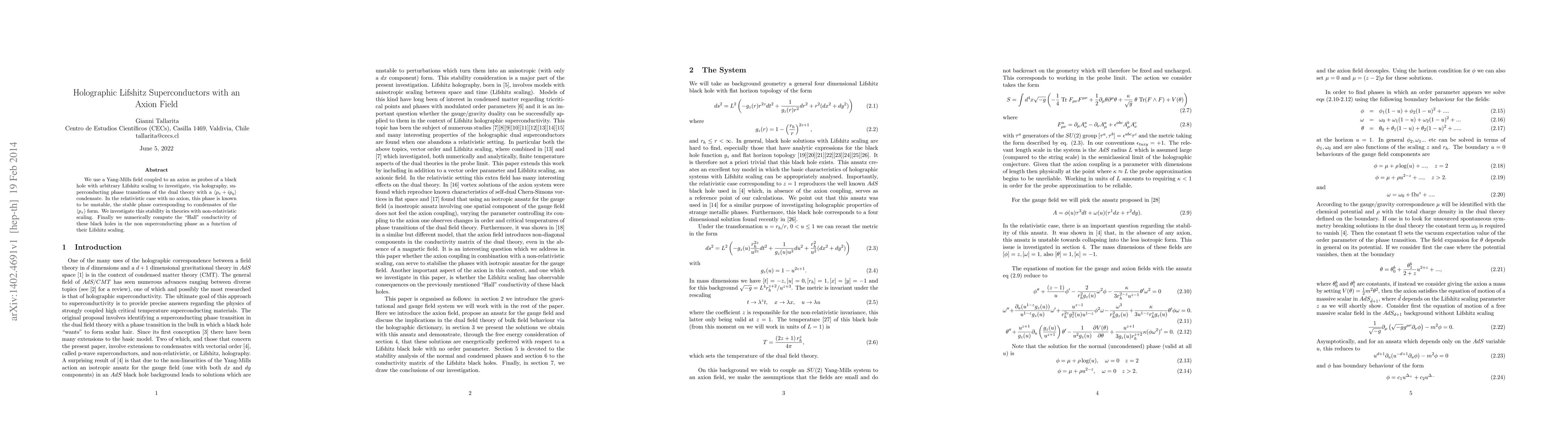 We use a Yang-Mills field coupled to an axion as probes of a black hole with arbitrary Lifshitz scaling to investigate, via holography, superconducting phase transitions of the dual theory with a $p_x+ip_y$ condensate. In the relativistic case with no axion, this phase is known to be unstable, the stable phase corresponding to condensates of the $p_x$ form. We investigate this stability in theories with non-relativistic scaling. Finally we numerically compute the "Hall" conductivity of these black holes in the non superconducting phase as a function of their Lifshitz scaling.