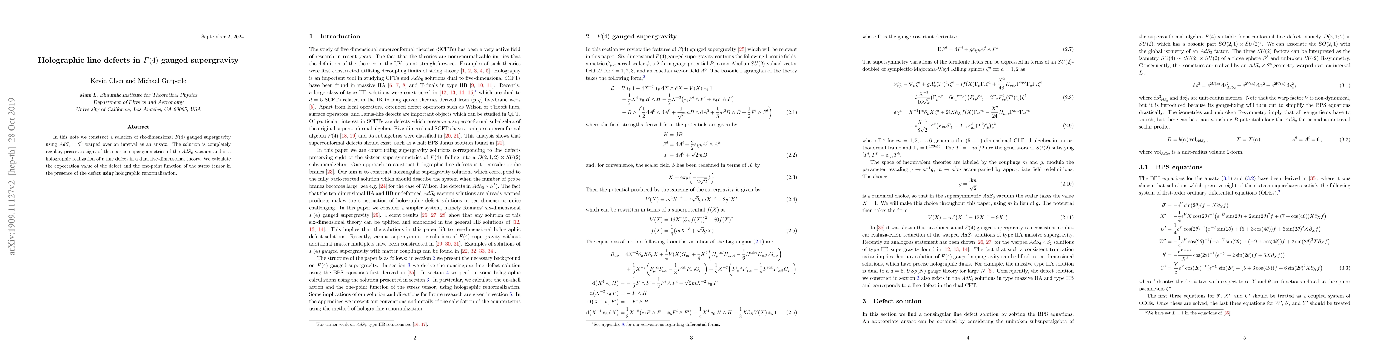 This paper constructs a regular six-dimensional $F(4)$ gauged supergravity solution preserving eight supersymmetries, representing a holographic line defect in a dual five-dimensional theory. It calculates the defect's expectation value and stress tensor one-point function using holographic renormalization.
