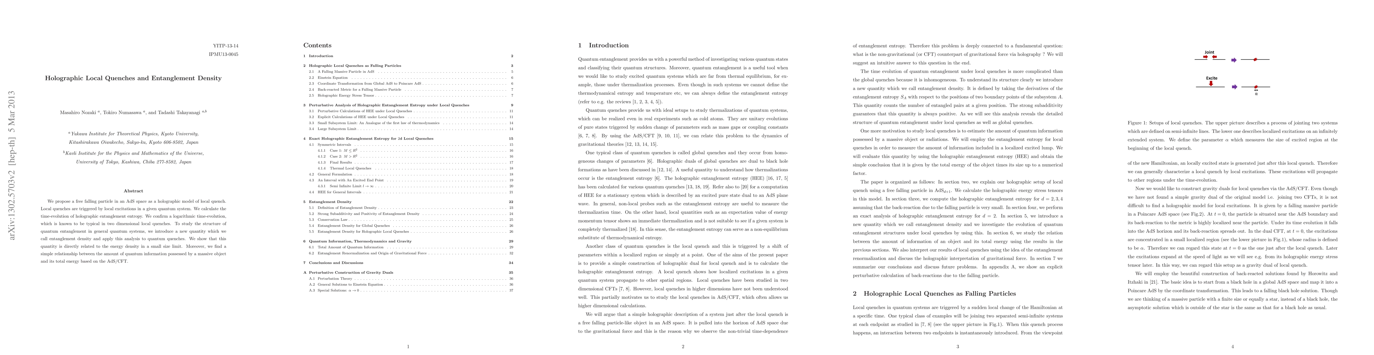 We propose a free falling particle in an AdS space as a holographic model of local quench. Local quenches are triggered by local excitations in a given quantum system. We calculate the time-evolution of holographic entanglement entropy. We confirm a logarithmic time-evolution, which is known to be typical in two dimensional local quenches. To study the structure of quantum entanglement in general quantum systems, we introduce a new quantity which we call entanglement density and apply this analysis to quantum quenches. We show that this quantity is directly related to the energy density in a small size limit. Moreover, we find a simple relationship between the amount of quantum information possessed by a massive object and its total energy based on the AdS/CFT.