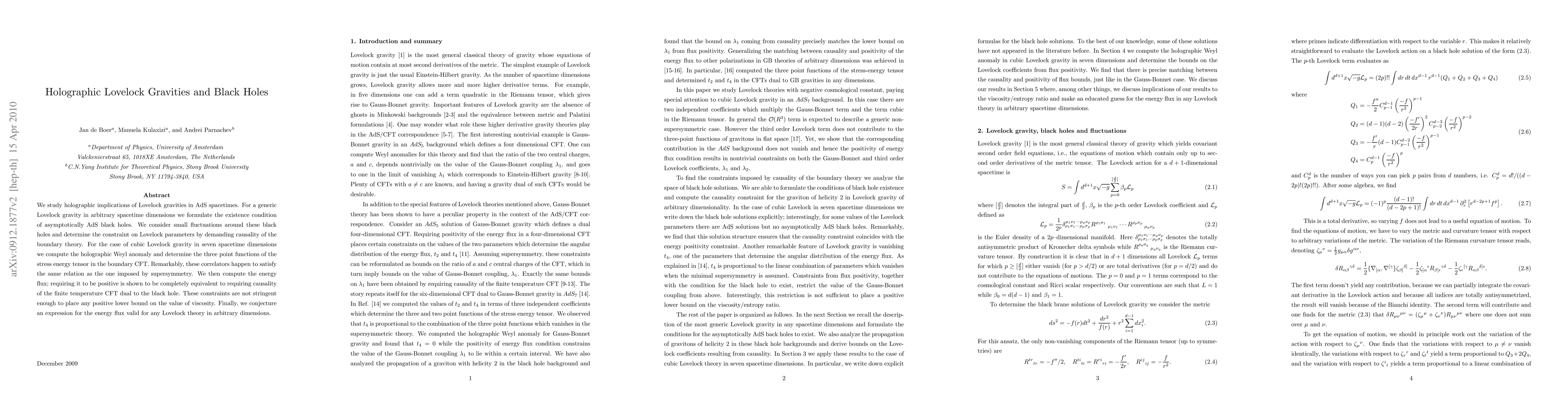 We study holographic implications of Lovelock gravities in AdS spacetimes. For a generic Lovelock gravity in arbitrary spacetime dimensions we formulate the existence condition for asymptotically AdS black holes. We consider small fluctuations around these black holes and determine the constraint on Lovelock parameters by demanding causality of the boundary theory. For the case of cubic Lovelock gravity in seven spacetime dimensions we compute the holographic Weyl anomaly and determine the three point functions of the stress energy tensor in the boundary CFT. Remarkably, these correlators happen to satisfy the same relation as the one imposed by supersymmetry. We then compute the energy flux; requiring it to be positive is shown to be completely equivalent to requiring causality of the finite temperature CFT dual to the black hole. These constraints are not stringent enough to place any positive lower bound on the value of viscosity. Finally, we conjecture an expression for the energy flux valid for any Lovelock theory in arbitrary dimensions.