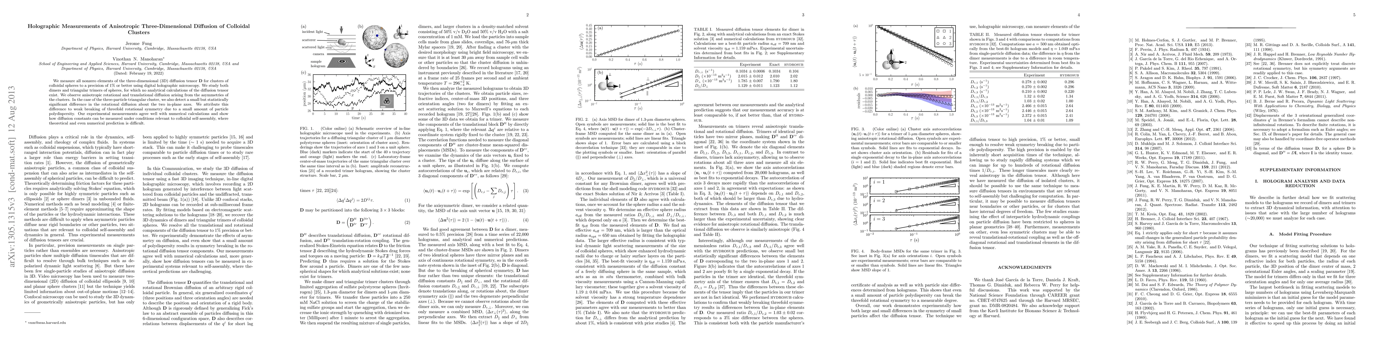 We measure all nonzero elements of the three-dimensional (3D) diffusion tensor D for clusters of colloidal spheres to a precision of 1% or better using digital holographic microscopy. We study both dimers and triangular trimers of spheres, for which no analytical calculations of the diffusion tensor exist. We observe anisotropic rotational and translational diffusion arising from the asymmetries of the clusters. In the case of the three-particle triangular cluster, we also detect a small but statistically significant difference in the rotational diffusion about the two in-plane axes. We attribute this difference to weak breaking of threefold rotational symmetry due to a small amount of particle polydispersity. Our experimental measurements agree well with numerical calculations and show how diffusion constants can be measured under conditions relevant to colloidal self-assembly, where theoretical and even numerical prediction is difficult.