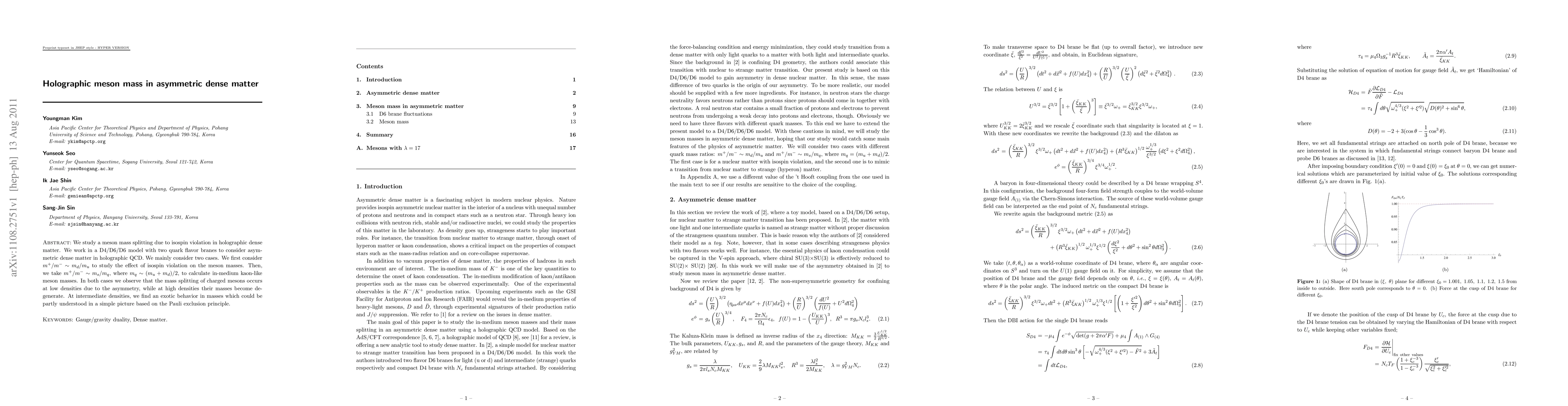 We study a meson mass splitting due to isospin violation in holographic dense matter. We work in a D4/D6/D6 model with two quark flavor branes to consider asymmetric dense matter in holographic QCD. We mainly consider two cases. We first consider $m^+/m^-\sim m_d/m_u$ to study the effect of isospin violation on the meson masses. Then, we take $m^+/m^-\sim m_s/m_q$, where $m_q\sim(m_u+m_d)/2$, to calculate in-medium kaon-like meson masses. In both cases we observe that the mass splitting of charged mesons occurs at low densities due to the asymmetry, while at high densities their masses become degenerate. At intermediate densities, we find an exotic behavior in masses which could be partly understood in a simple picture based on the Pauli exclusion principle.