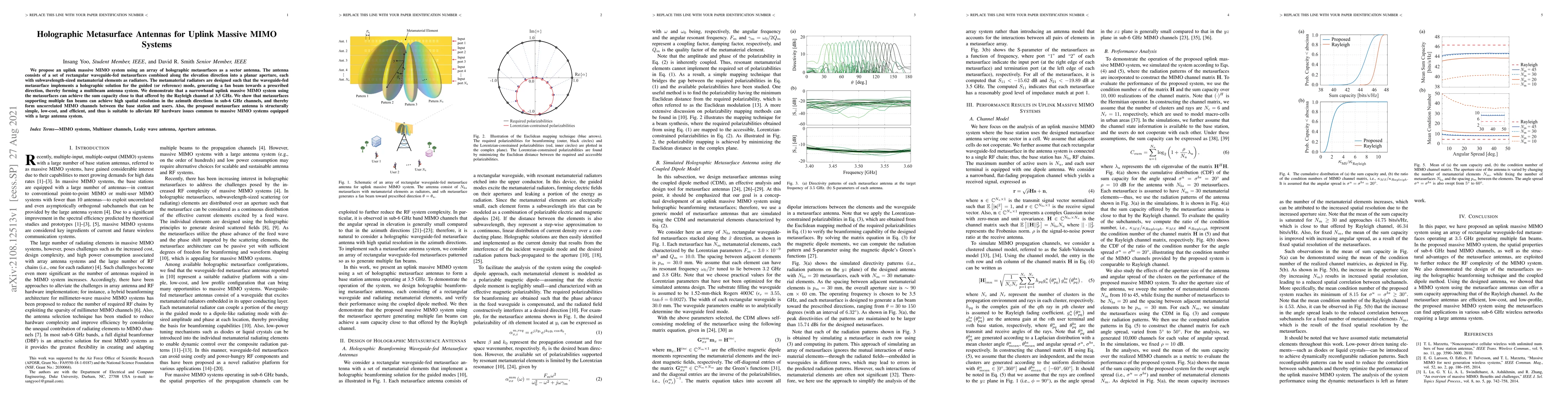 This paper proposes a novel holographic metasurface antenna for uplink massive MIMO systems, demonstrating high spatial resolution and sum capacity near Rayleigh channel performance at 3.5 GHz. The metasurface design is simple, low-cost, and efficient, addressing common RF hardware issues in massive MIMO systems.