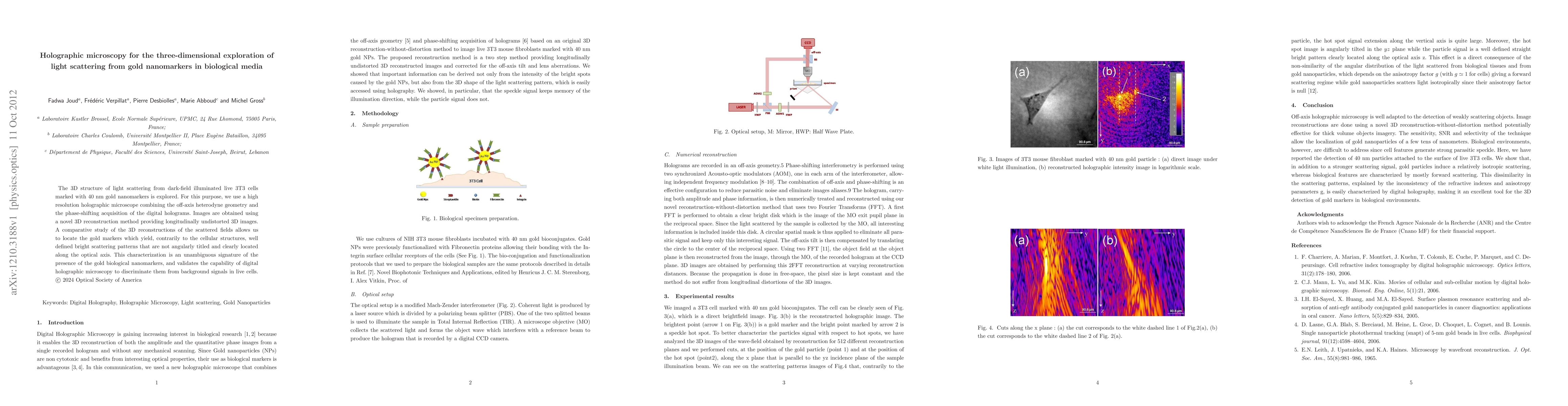 This paper explores the 3D light scattering from gold nanomarkers in live cells using a high-resolution holographic microscope. The study validates the technique's ability to distinctly locate gold nanomarkers by their bright scattering patterns, confirming the method's efficacy in discriminating them from cellular background signals.