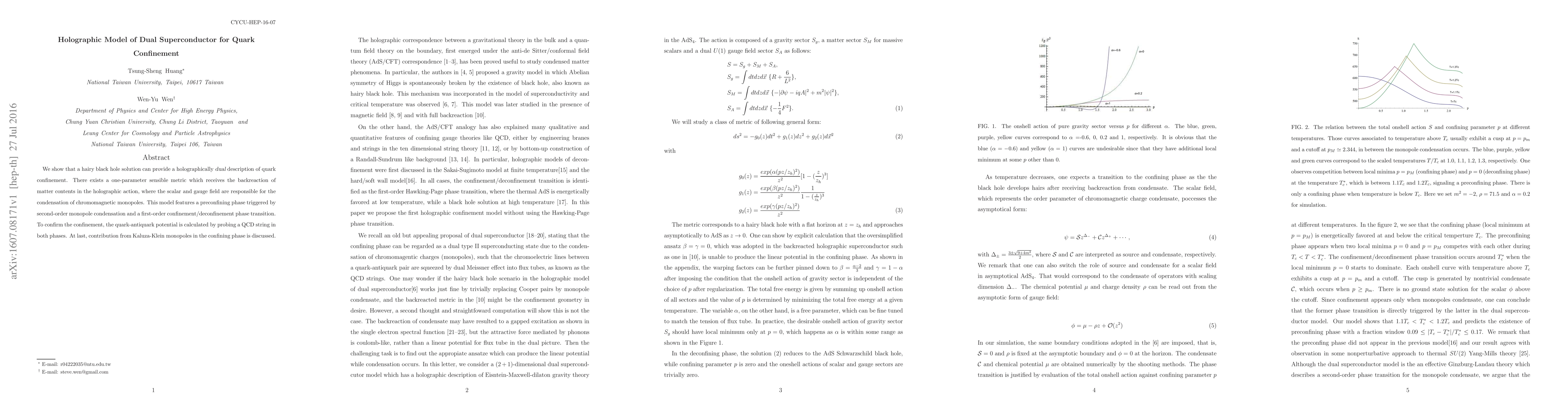 We show that a hairy black hole solution can provide a holographically dual description of quark confinement. There exists a one-parameter sensible metric which receives the backreaction of matter contents in the holographic action, where the scalar and gauge field are responsible for the condensation of chromomagnetic monopoles. This model features a preconfining phase triggered by second-order monopole condensation and a first-order confinement/deconfinement phase transition. To confirm the confinement, the quark-antiquark potential is calculated by probing a QCD string in both phases. At last, contribution from Kaluza-Klein monopoles in the confining phase is discussed.