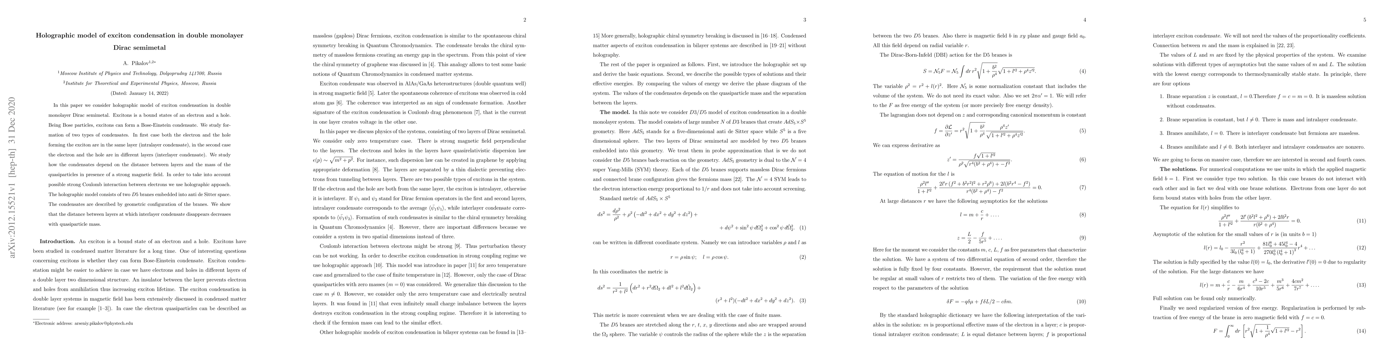 Researchers used a holographic model to study exciton condensation in double monolayer Dirac semimetals, finding that the distance between layers at which interlayer condensates disappear decreases with increasing quasiparticle mass.