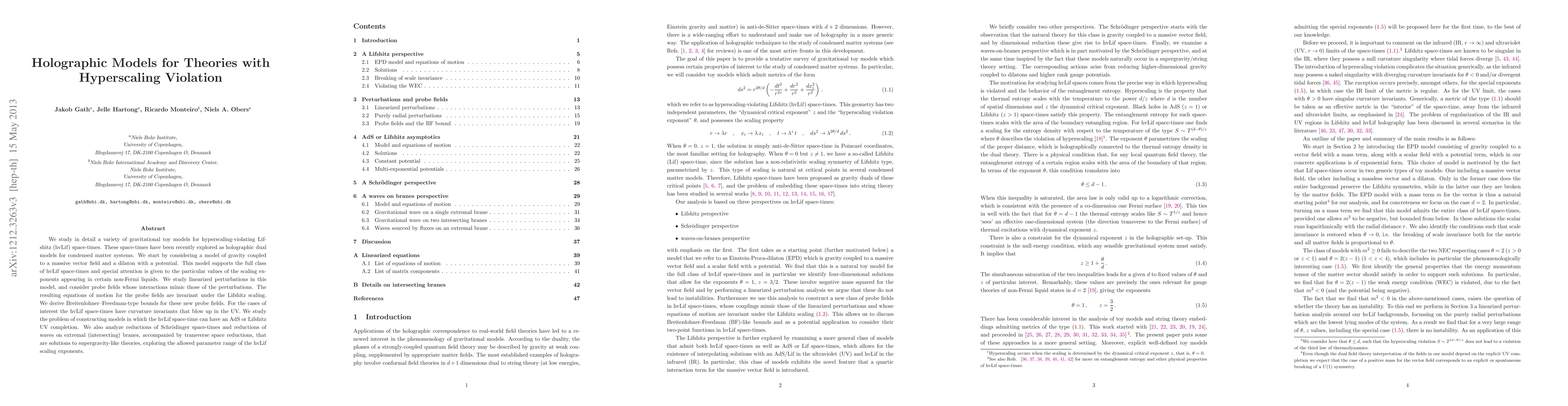 We study in detail a variety of gravitational toy models for hyperscaling-violating Lifshitz (hvLif) space-times. These space-times have been recently explored as holographic dual models for condensed matter systems. We start by considering a model of gravity coupled to a massive vector field and a dilaton with a potential. This model supports the full class of hvLif space-times and special attention is given to the particular values of the scaling exponents appearing in certain non-Fermi liquids. We study linearized perturbations in this model, and consider probe fields whose interactions mimic those of the perturbations. The resulting equations of motion for the probe fields are invariant under the Lifshitz scaling. We derive Breitenlohner-Freedman-type bounds for these new probe fields. For the cases of interest the hvLif space-times have curvature invariants that blow up in the UV. We study the problem of constructing models in which the hvLif space-time can have an AdS or Lifshitz UV completion. We also analyze reductions of Schroedinger space-times and reductions of waves on extremal (intersecting) branes, accompanied by transverse space reductions, that are solutions to supergravity-like theories, exploring the allowed parameter range of the hvLif scaling exponents.