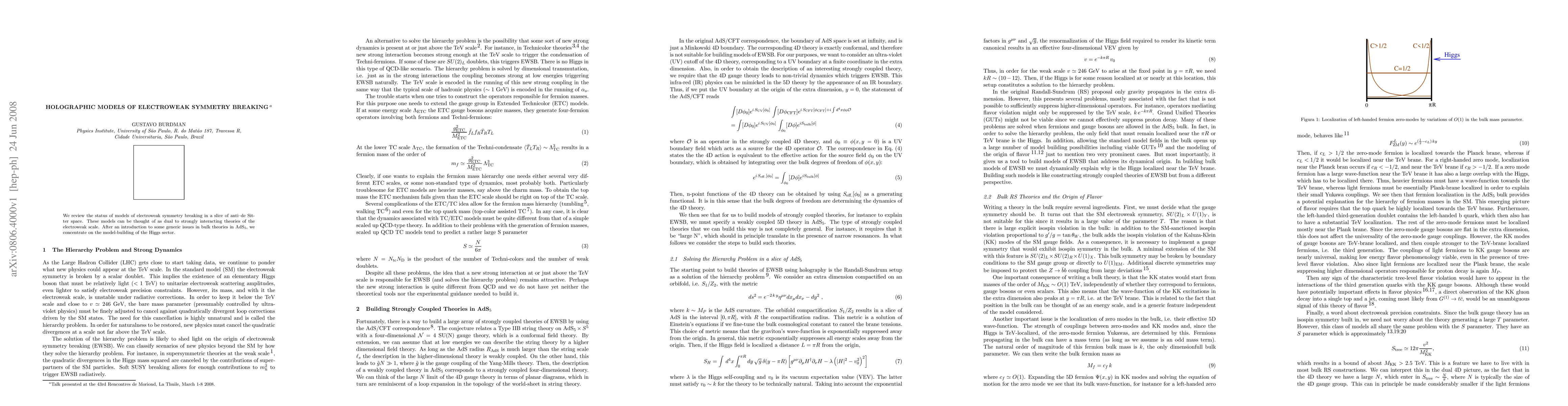 We review the status of models of electroweak symmetry breaking in a slice of anti--de Sitter space. These models can be thought of as dual to strongly interacting theories of the electroweak scale. After an introduction to some generic issues in bulk theories in AdS5, we concentrate on the model-building of the Higgs sector.