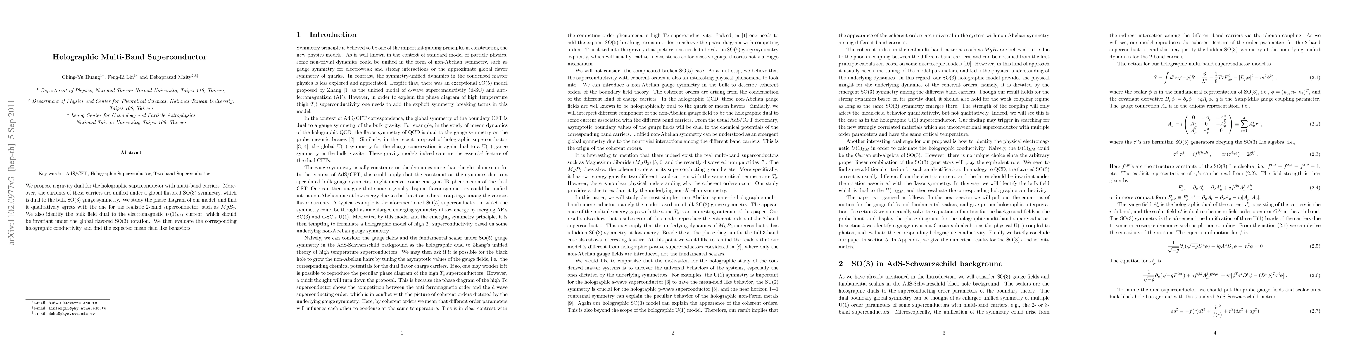 We propose a gravity dual for the holographic superconductor with multi-band carriers. Moreover, the currents of these carriers are unified under a global flavored SO(3) symmetry, which is dual to the bulk SO(3) gauge symmetry. We study the phase diagram of our model, and find it qualitatively agrees with the one for the realistic 2-band superconductor, such as $MgB_2$. We also identify the bulk field dual to the electromagnetic $U(1)_{EM}$ current, which should be invariant under the global flavored SO(3) rotation. We then evaluate the corresponding holographic conductivity and find the expected mean field like behaviors.