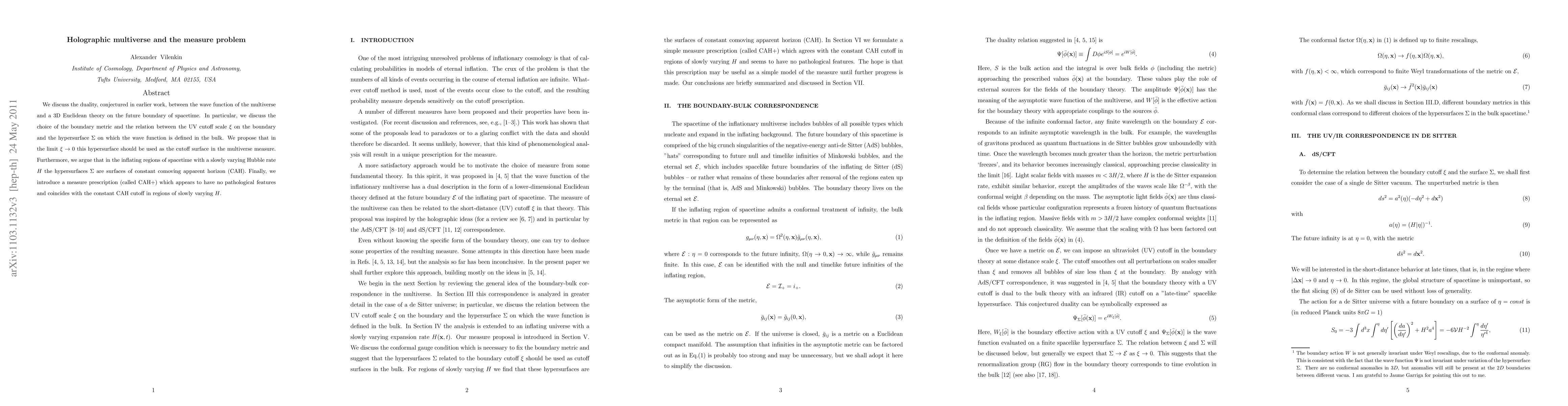 This paper explores the duality between the multiverse wave function and a 3D Euclidean theory on its future boundary, proposing that small boundary cutoff scales relate to bulk hypersurfaces. It introduces a measure prescription (CAH+) that avoids pathologies and aligns with constant comoving apparent horizon cutoffs in regions with slowly varying Hubble rates.