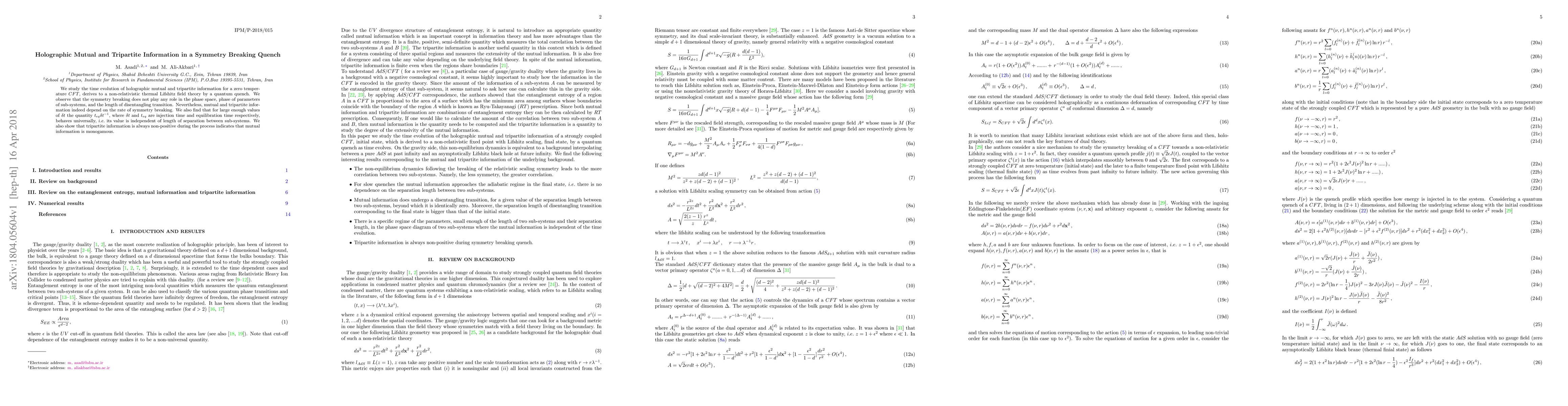 We study the time evolution of holographic mutual and tripartite information for a zero temperature $CFT$, derives to a non-relativistic thermal Lifshitz field theory by a quantum quench. We observe that the symmetry breaking does not play any role in the phase space, phase of parameters of sub-systems, and the length of disentangling transition. Nevertheless, mutual and tripartite information indeed depend on the rate of symmetry breaking. We also find that for large enough values of $\delta t$ the quantity $t_{eq}\delta t^{-1}$, where $\delta t$ and $t_{eq}$ are injection time and equilibration time respectively, behaves universally, $i.e.$ its value is independent of length of separation between sub-systems. We also show that tripartite information is always non-positive during the process indicates that mutual information is monogamous.