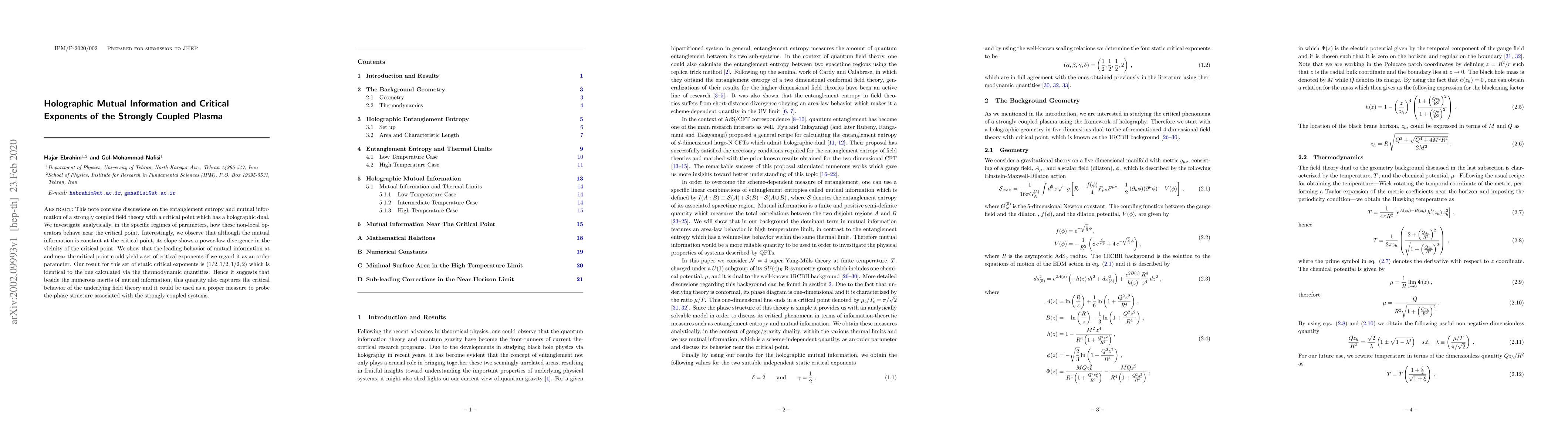This note contains discussions on the entanglement entropy and mutual information of a strongly coupled field theory with a critical point which has a holographic dual. We investigate analytically, in the specific regimes of parameters, how these non-local operators behave near the critical point. Interestingly, we observe that although the mutual information is constant at the critical point, its slope shows a power-law divergence in the vicinity of the critical point. We show that the leading behavior of mutual information at and near the critical point could yield a set of critical exponents if we regard it as an order parameter. Our result for this set of static critical exponents is (1/2,1/2,1/2,2) which is identical to the one calculated via the thermodynamic quantities. Hence it suggests that beside the numerous merits of mutual information, this quantity also captures the critical behavior of the underlying field theory and it could be used as a proper measure to probe the phase structure associated with the strongly coupled systems.