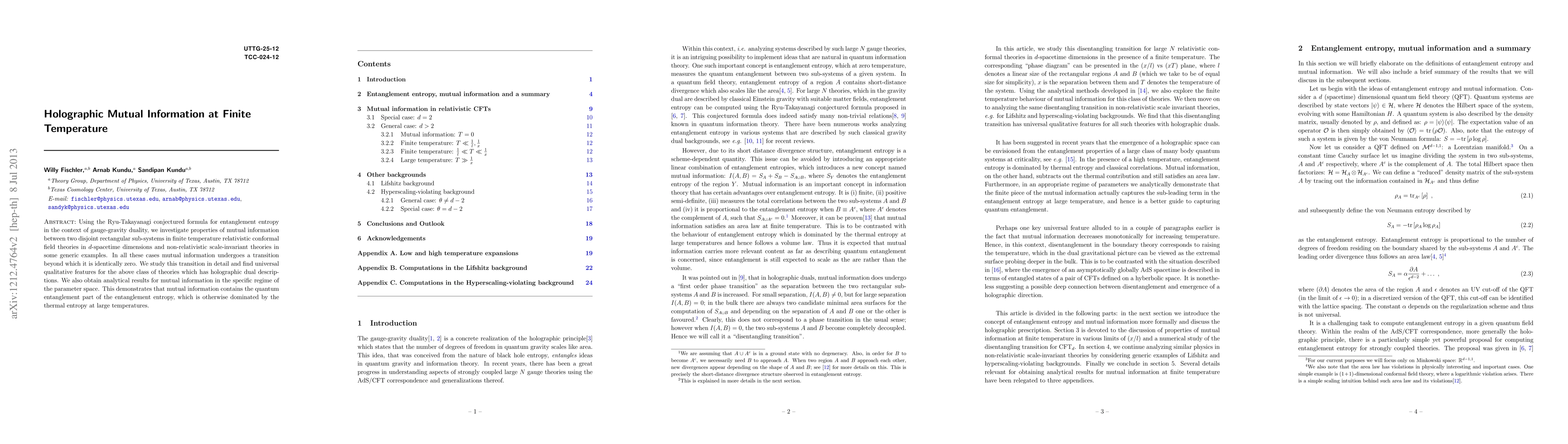 This paper explores mutual information in finite temperature relativistic and non-relativistic scale-invariant theories using the Ryu-Takayanagi conjecture and gauge-gravity duality. It finds a transition where mutual information becomes zero, revealing universal qualitative features in holographic dual theories and demonstrating that mutual information captures quantum entanglement beyond thermal entropy effects.