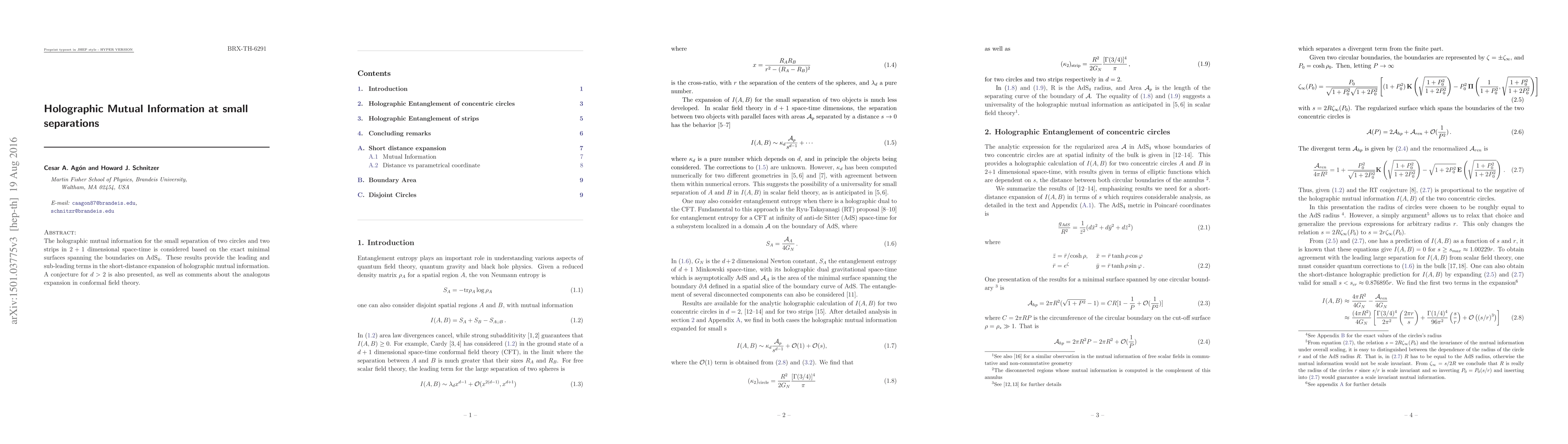This paper explores holographic mutual information for small separations in AdS4, finding a universal leading term in its short-distance expansion and proposing a conjecture for higher dimensions, alongside comparisons to conformal field theory.