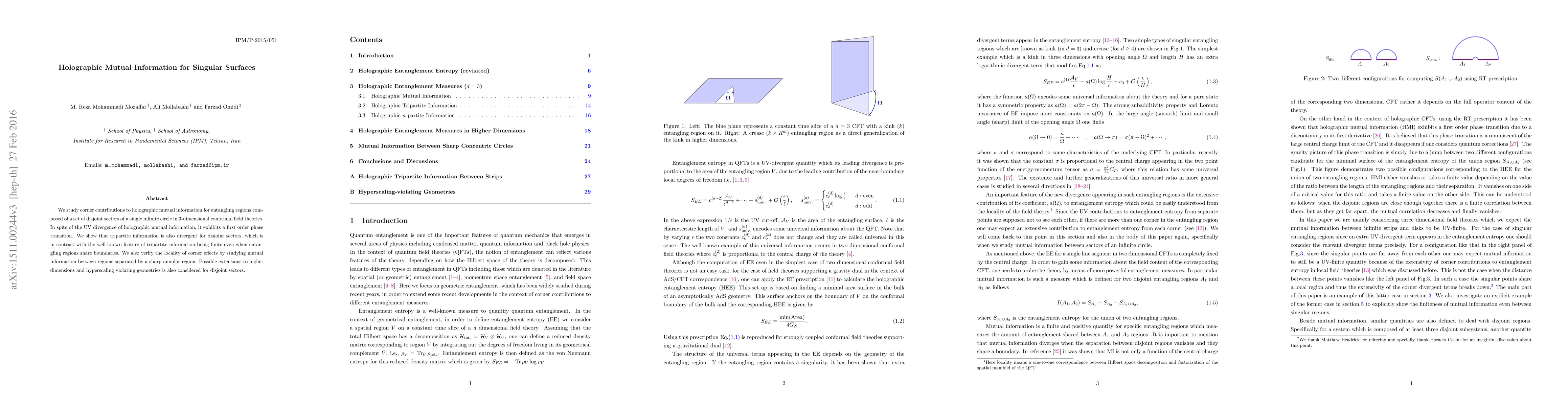 This paper investigates corner contributions to holographic mutual information in 3D conformal field theories, revealing a first-order phase transition despite UV divergence. It finds tripartite information also diverges for disjoint sectors, contrasting with regions sharing boundaries. The study also confirms the locality of corner effects through mutual information analysis.