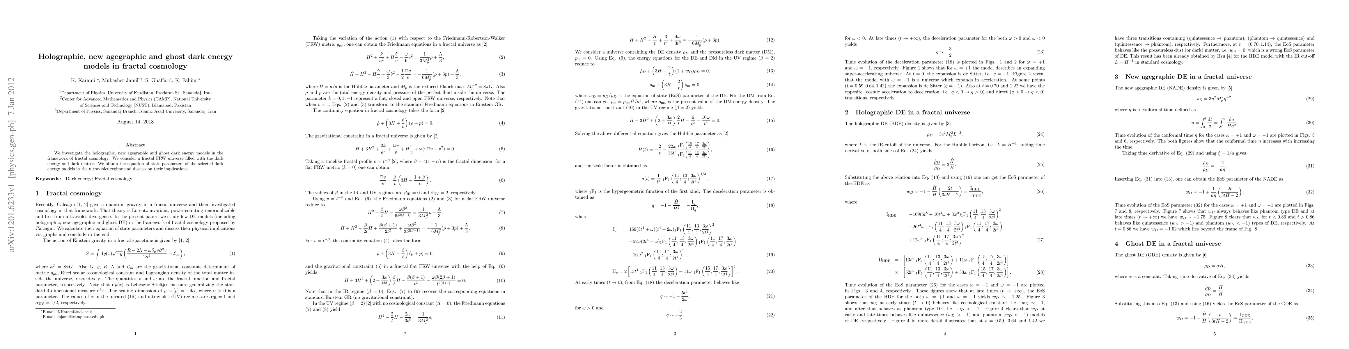 This paper explores holographic, new agegraphic, and ghost dark energy models within fractal cosmology, deriving the equation of state parameters for these models in the ultraviolet regime and discussing their implications for the universe's structure.