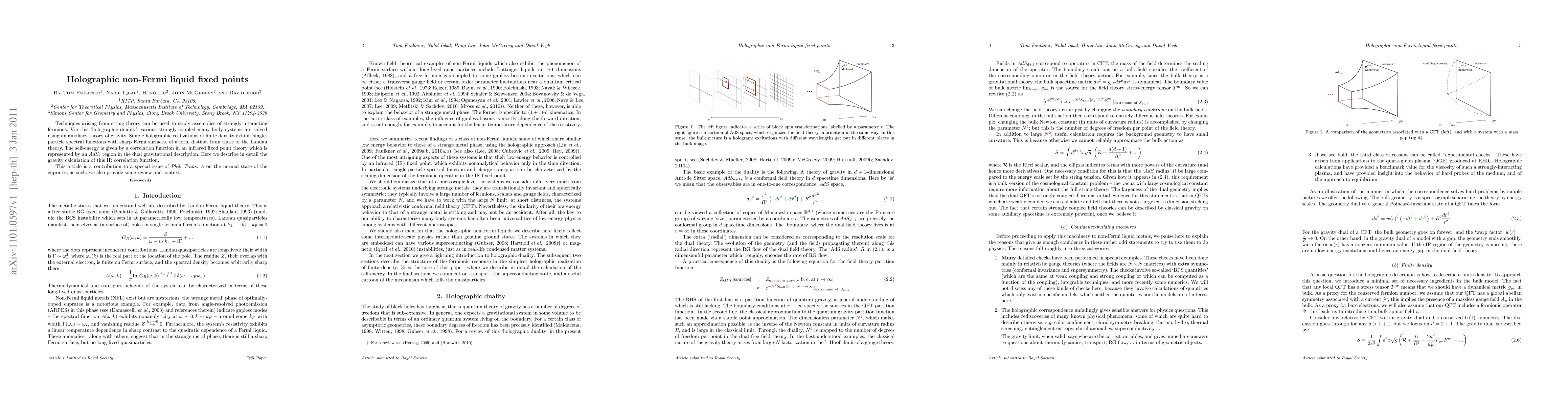 Techniques arising from string theory can be used to study assemblies of strongly-interacting fermions. Via this `holographic duality', various strongly-coupled many body systems are solved using an auxiliary theory of gravity. Simple holographic realizations of finite density exhibit single-particle spectral functions with sharp Fermi surfaces, of a form distinct from those of the Landau theory. The self-energy is given by a correlation function in an infrared fixed point theory which is represented by an AdS_2 region in the dual gravitational description. Here we describe in detail the gravity calculation of this IR correlation function. This article is a contribution to a special issue of Phil. Trans. A on the normal state of the cuprates; as such, we also provide some review and context.