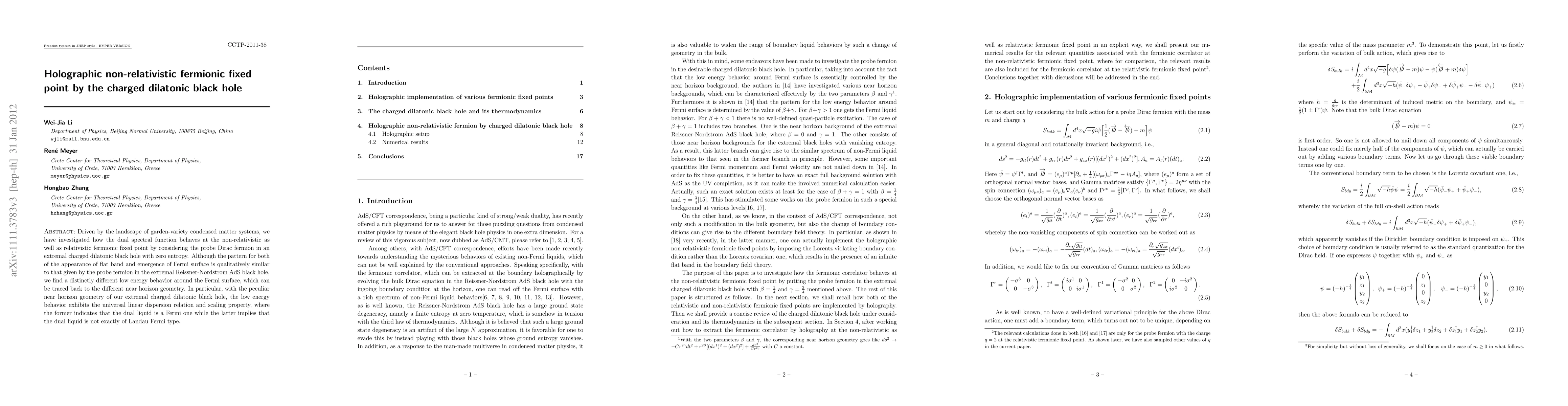 Driven by the landscape of garden-variety condensed matter systems, we have investigated how the dual spectral function behaves at the non-relativistic as well as relativistic fermionic fixed point by considering the probe Dirac fermion in an extremal charged dilatonic black hole with zero entropy. Although the pattern for both of the appearance of flat band and emergence of Fermi surface is qualitatively similar to that given by the probe fermion in the extremal Reissner-Nordstrom AdS black hole, we find a distinctly different low energy behavior around the Fermi surface, which can be traced back to the different near horizon geometry. In particular, with the peculiar near horizon geometry of our extremal charged dilatonic black hole, the low energy behavior exhibits the universal linear dispersion relation and scaling property, where the former indicates that the dual liquid is a Fermi one while the latter implies that the dual liquid is not exactly of Landau Fermi type.
