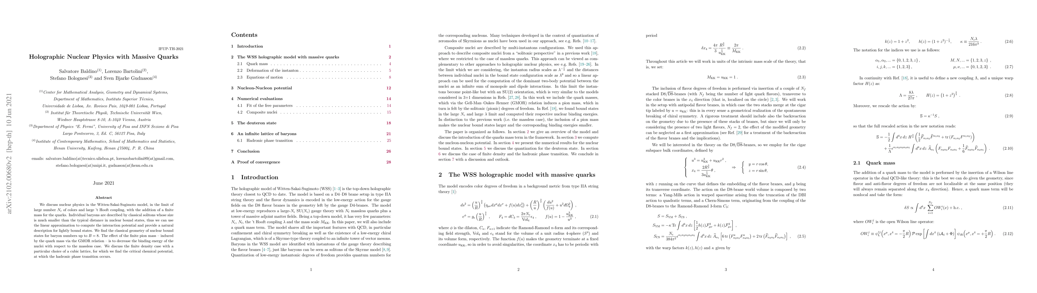 We discuss nuclear physics in the Witten-Sakai-Sugimoto model, in the limit of large number $N_c$ of colors and large 't Hooft coupling, with the addition of a finite mass for the quarks. Individual baryons are described by classical solitons whose size is much smaller than the typical distance in nuclear bound states, thus we can use the linear approximation to compute the interaction potential and provide a natural description for lightly bound states. We find the classical geometry of nuclear bound states for baryon numbers up to B=8. The effect of the finite pion mass - induced by the quark mass via the GMOR relation - is to decrease the binding energy of the nuclei with respect to the massless case. We discuss the finite density case with a particular choice of a cubic lattice, for which we find the critical chemical potential, at which the hadronic phase transition occurs.