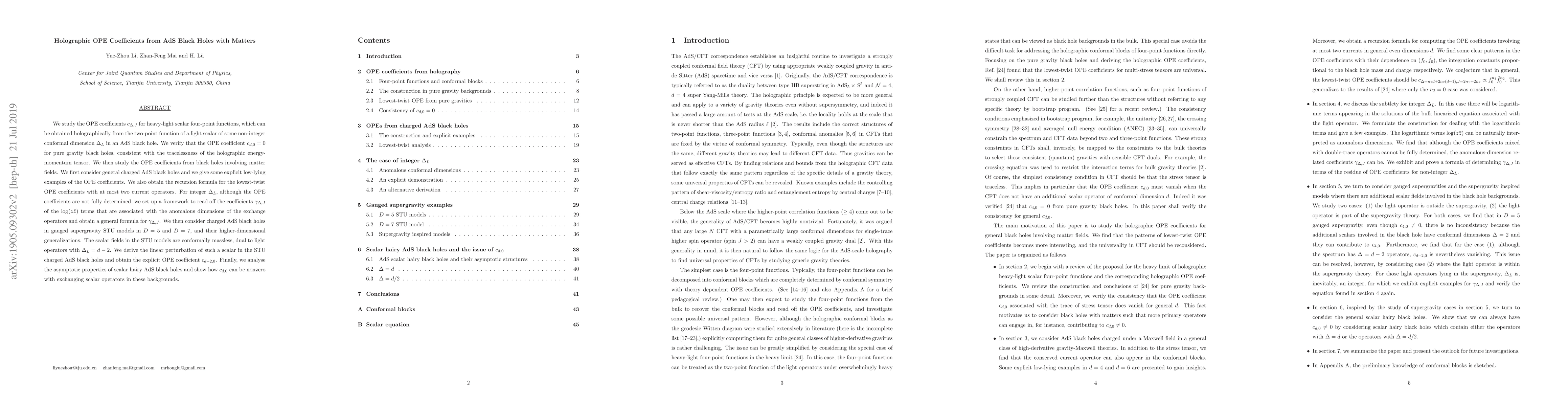 Researchers studied holographic OPE coefficients from AdS black holes with matter fields, verifying consistency with tracelessness of the energy-momentum tensor and deriving formulas for OPE coefficients in charged supergravity models.