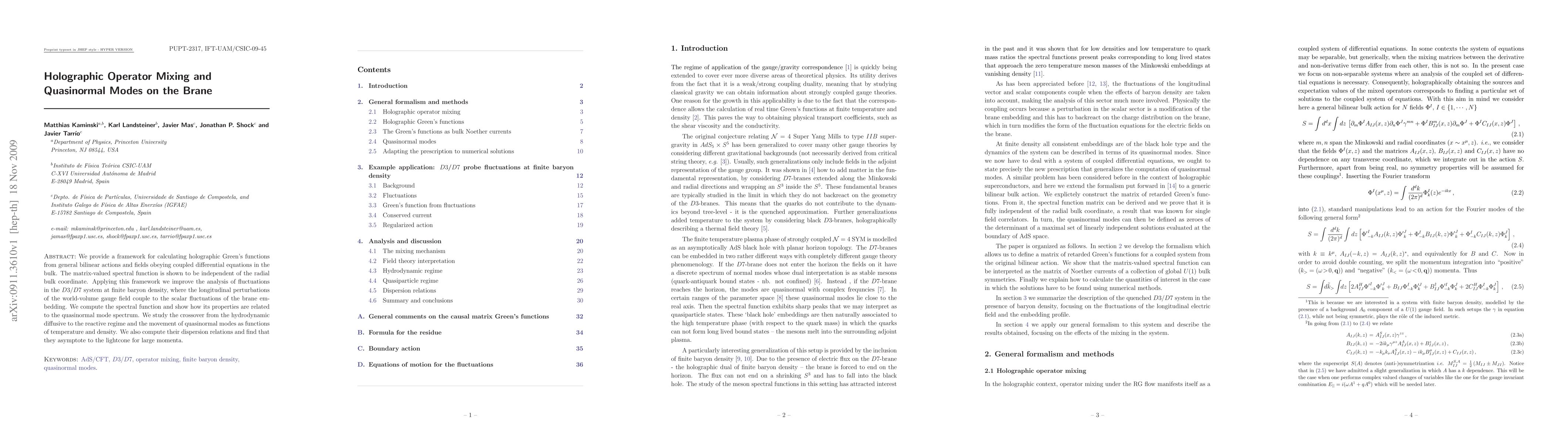 We provide a framework for calculating holographic Green's functions from general bilinear actions and fields obeying coupled differential equations in the bulk. The matrix-valued spectral function is shown to be independent of the radial bulk coordinate. Applying this framework we improve the analysis of fluctuations in the D3/D7 system at finite baryon density, where the longitudinal perturbations of the world-volume gauge field couple to the scalar fluctuations of the brane embedding. We compute the spectral function and show how its properties are related to the quasinormal mode spectrum. We study the crossover from the hydrodynamic diffusive to the reactive regime and the movement of quasinormal modes as functions of temperature and density. We also compute their dispersion relations and find that they asymptote to the lightcone for large momenta.