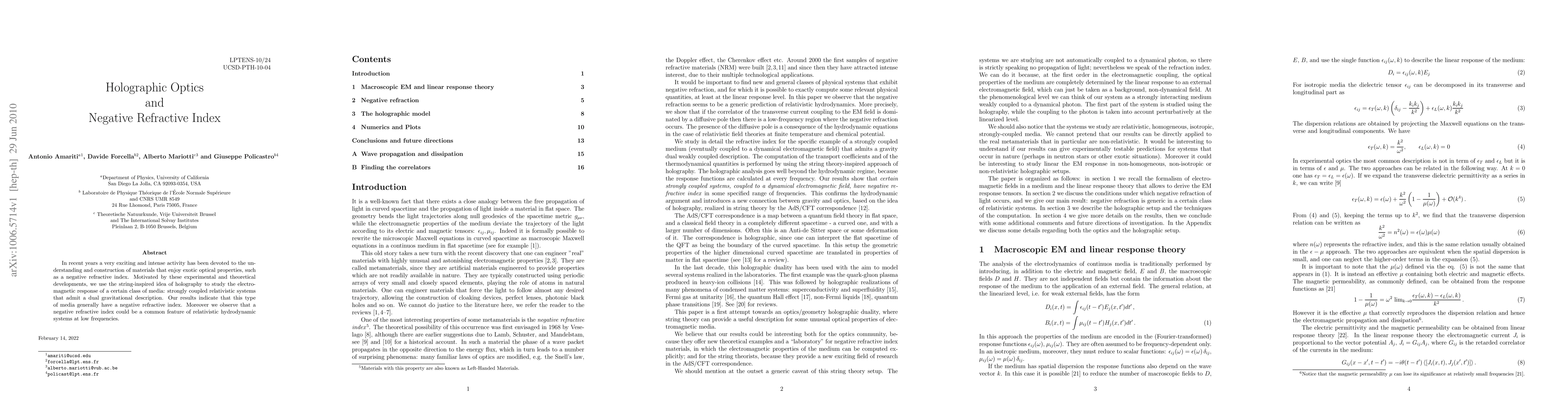 In recent years a very exciting and intense activity has been devoted to the understanding and construction of materials that enjoy exotic optical properties, such as a negative refractive index. Motivated by these experimental and theoretical developments, we use the string-inspired idea of holography to study the electromagnetic response of a certain class of media: strongly coupled relativistic systems that admit a dual gravitational description. Our results indicate that this type of media generally have a negative refractive index. Moreover we observe that a negative refractive index could be a common feature of relativistic hydrodynamic systems at low frequencies.