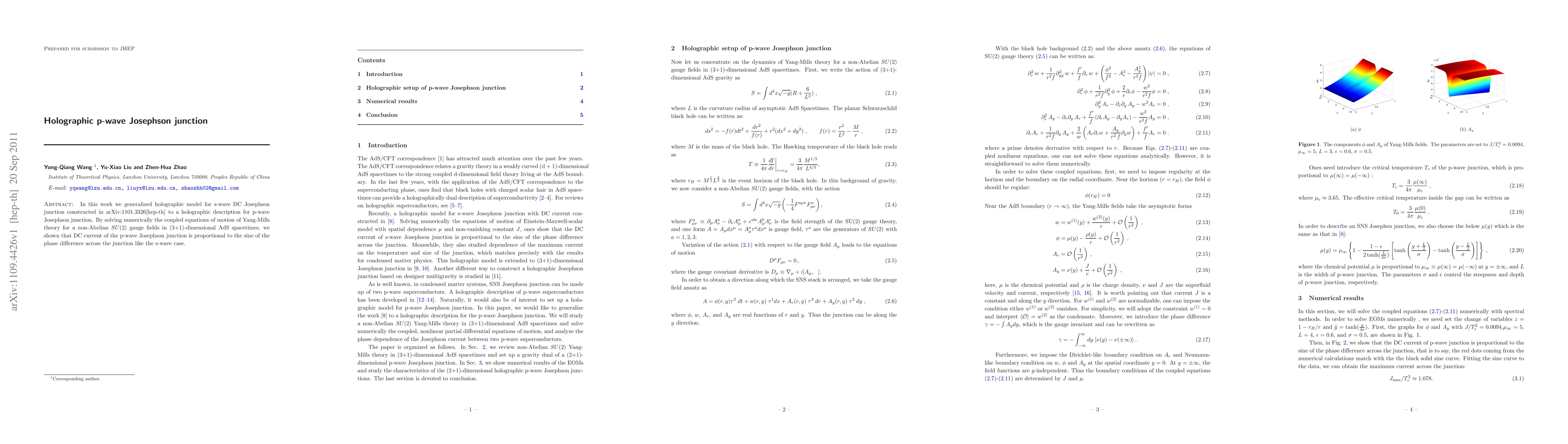 This paper generalizes a holographic model for s-wave Josephson junctions to describe p-wave Josephson junctions using non-Abelian SU(2) gauge fields in AdS spacetime. It demonstrates that the DC current in p-wave junctions follows the same sine-phase relationship as in s-wave junctions.
