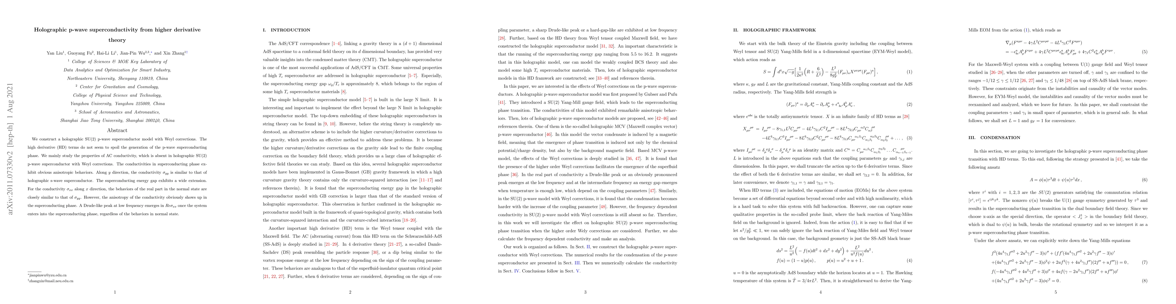 This research constructs a holographic model of SU(2) p-wave superconductivity with Weyl corrections, finding that high derivative terms do not hinder the emergence of the p-wave phase. The study reveals anisotropic AC conductivity behaviors, with a Drude-like peak appearing in the superconducting phase, indicating distinct conductivity properties in different directions.